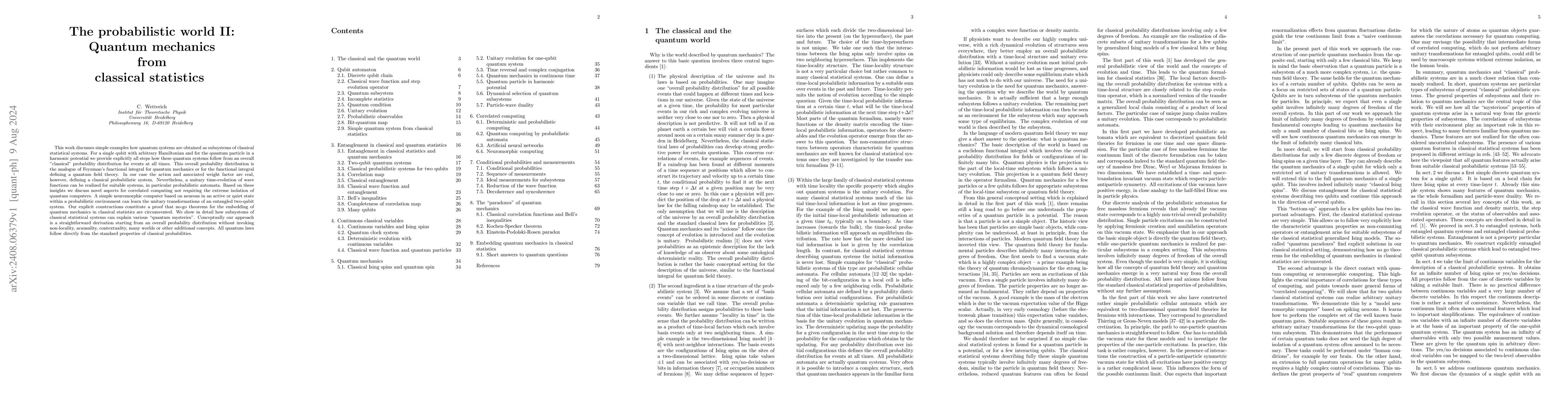 This work discusses simple examples how quantum systems are obtained as subsystems of classical statistical systems. For a single qubit with arbitrary Hamiltonian and for the quantum particle in a harmonic potential we provide explicitly all steps how these quantum systems follow from an overall ''classical" probability distribution for events at all times. This overall probability distribution is the analogue of Feynman's functional integral for quantum mechanics or for the functional integral defining a quantum field theory. In our case the action and associated weight factor are real, however, defining a classical probabilistic system. Nevertheless, a unitary time-evolution of wave functions can be realized for suitable systems, in particular probabilistic automata. Based on these insights we discuss novel aspects for correlated computing not requiring the extreme isolation of quantum computers. A simple neuromorphic computer based on neurons in an active or quiet state within a probabilistic environment can learn the unitary transformations of an entangled two-qubit system. Our explicit constructions constitute a proof that no-go theorems for the embedding of quantum mechanics in classical statistics are circumvented. We show in detail how subsystems of classical statistical systems can explain various ``quantum mysteries". Conceptually our approach is a straightforward derivation starting from an overall probability distribution without invoking non-locality, acausality, contextuality, many worlds or other additional concepts. All quantum laws follow directly from the standard properties of classical probabilities.