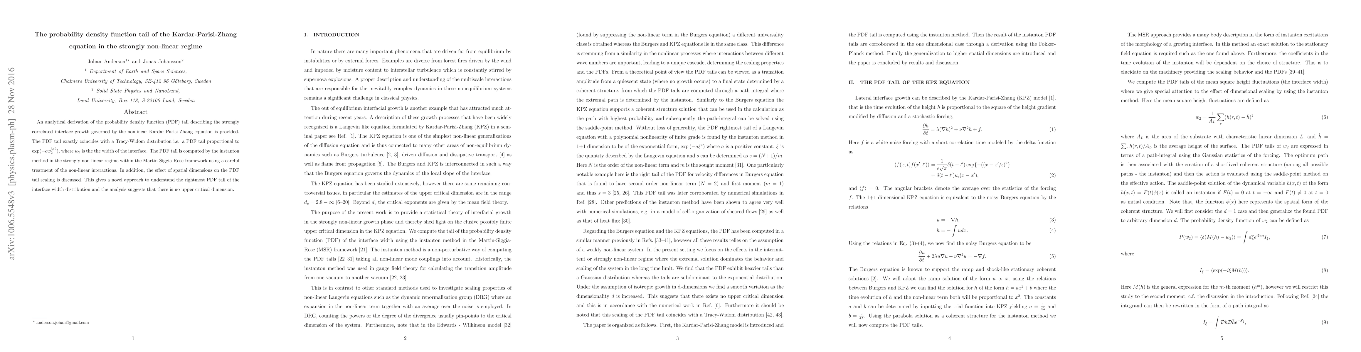 An analytical derivation of the probability density function (PDF) tail describing the strongly correlated interface growth governed by the nonlinear Kardar-Parisi-Zhang equation is provided. The PDF tail exactly coincides with a Tracy-Widom distribution i.e. a PDF tail proportional to $\exp( - c w_2^{3/2})$, where $w_2$ is the the width of the interface. The PDF tail is computed by the instanton method in the strongly non-linear regime within the Martin-Siggia-Rose framework using a careful treatment of the non-linear interactions. In addition, the effect of spatial dimensions on the PDF tail scaling is discussed. This gives a novel approach to understand the rightmost PDF tail of the interface width distribution and the analysis suggests that there is no upper critical dimension.