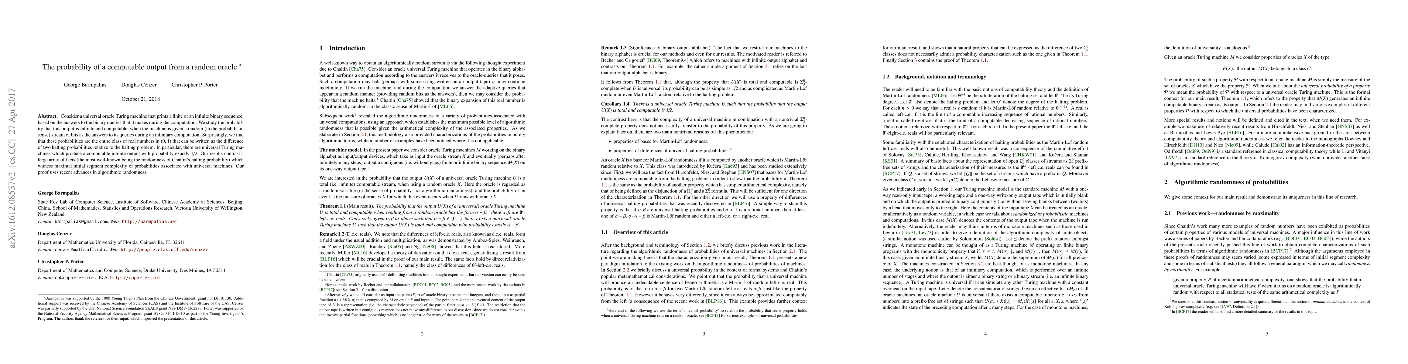 Consider a universal Turing machine that produces a partial or total function (or a binary stream), based on the answers to the binary queries that it makes during the computation. We study the probability that the machine will produce a computable function when it is given a random stream of bits as the answers to its queries. Surprisingly, we find that these probabilities are the entire class of real numbers in (0, 1) that can be written as the difference of two halting probabilities relative to the halting problem. In particular, there are universal Turing machines which produce a computable output with probability exactly 1/2. Our results contrast a large array of facts (the most well-known being the randomness of Chaitin's halting probability) which witness maximal initial segment complexity of probabilities associated with universal machines. Our proof uses recent advances in algorithmic randomness.