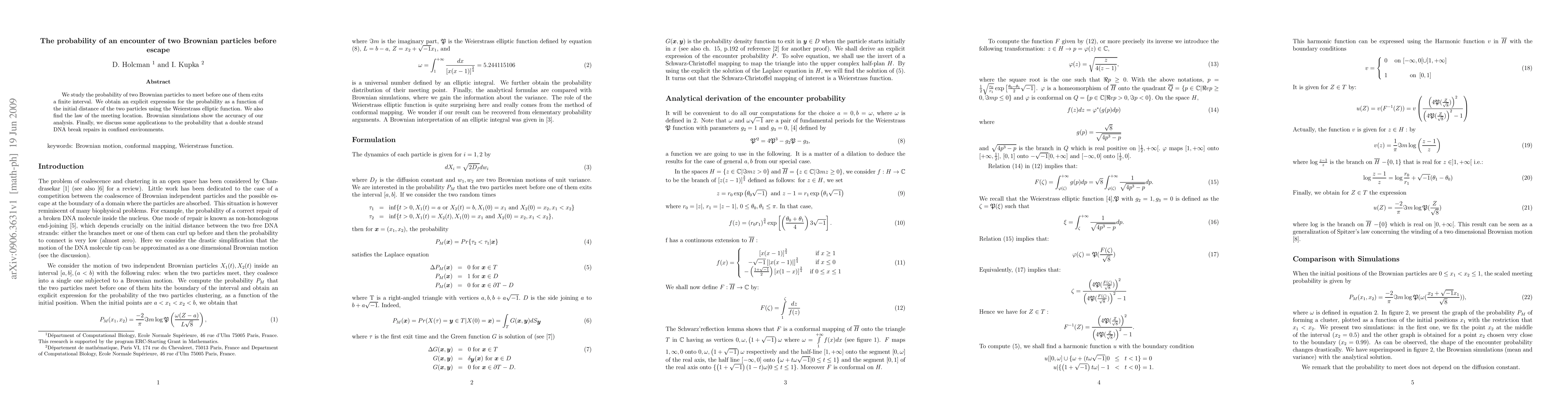 We study the probability of two Brownian particles to meet before one of them exits a finite interval. We obtain an explicit expression for the probability as a function of the initial distance of the two particles using the Weierstrass elliptic function. We also find the law of the meeting location. Brownian simulations show the accuracy of our analysis. Finally, we discuss some applications to the probability that a double strand DNA break repairs in confined environments.