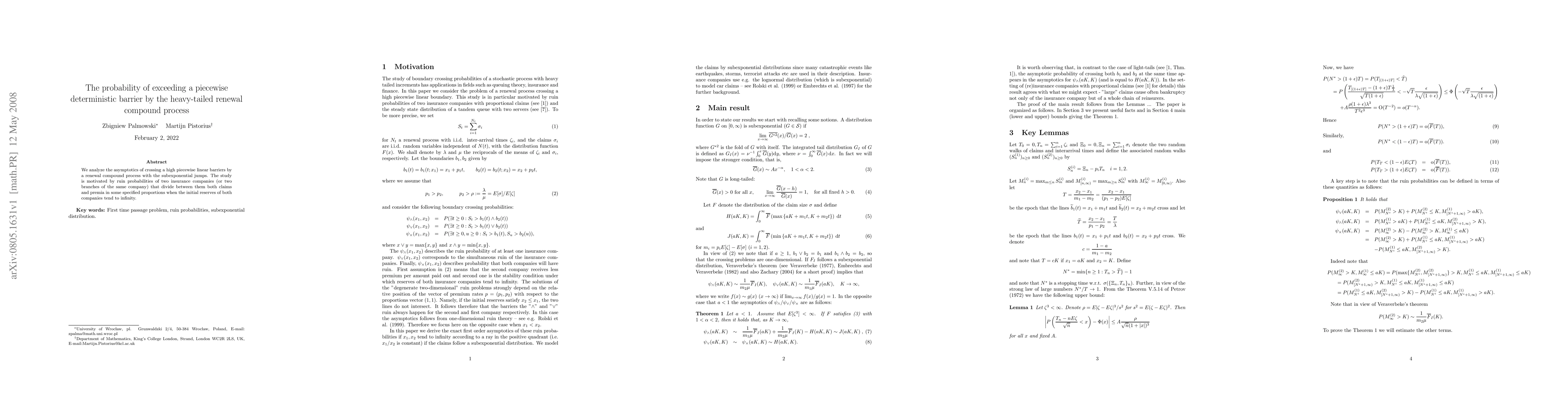 We analyze the asymptotics of crossing a high piecewise linear barriers by a renewal compound process with the subexponential jumps. The study is motivated by ruin probabilities of two insurance companies (or two branches of the same company) that divide between them both claims and premia in some specified proportions when the initial reserves of both companies tend to infinity.