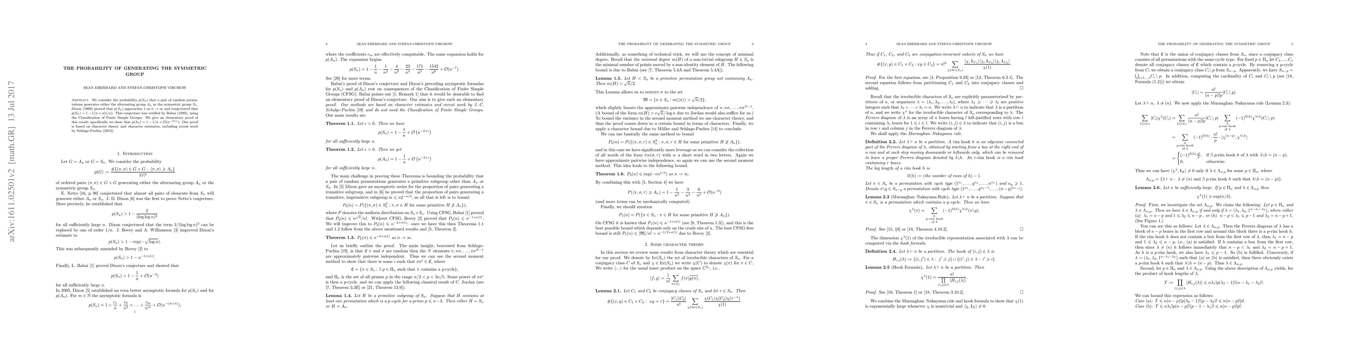 Researchers prove that the probability of generating either the alternating group A_n or the symmetric group S_n approaches 1 as n increases, with a refined estimate of 1-1/n+O(n^{-2+υ}) using character theory.