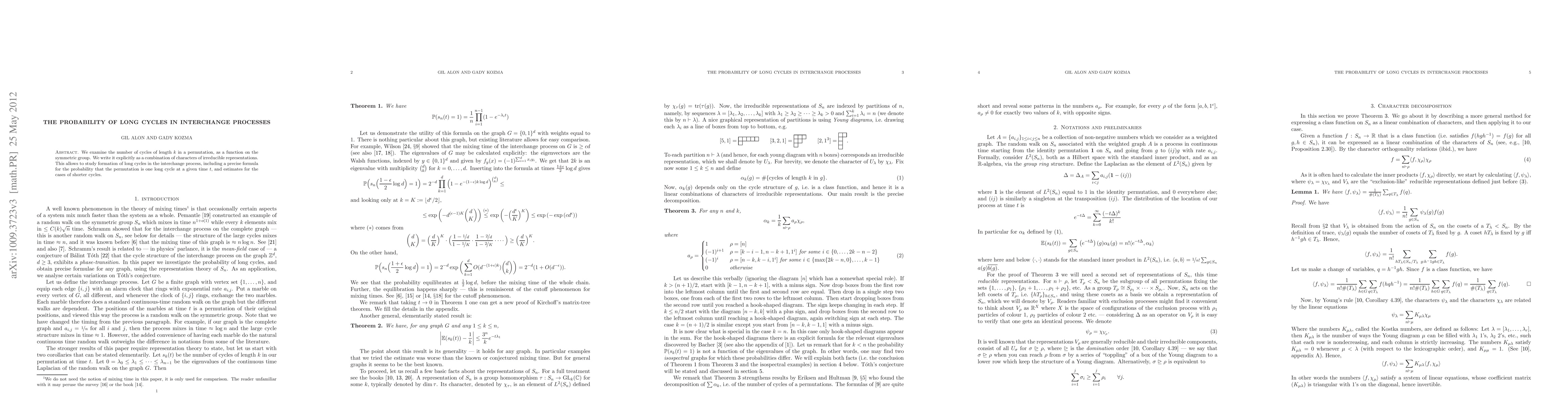 We examine the number of cycles of length k in a permutation, as a function on the symmetric group. We write it explicitly as a combination of characters of irreducible representations. This allows to study formation of long cycles in the interchange process, including a precise formula for the probability that the permutation is one long cycle at a given time t, and estimates for the cases of shorter cycles.