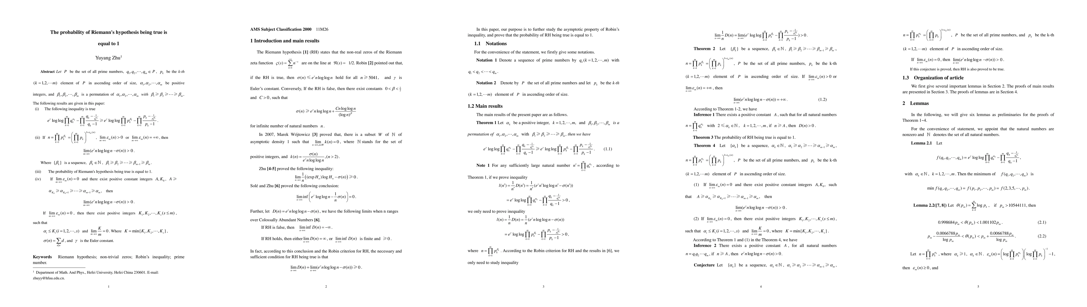 Let $P$ be the set of all prime numbers, ${q_1},{q_2}, \cdots ,{q_m} \in P$, $P_k$ be the k-th $(k = 1,2, \cdots m)$ element of $P$ in ascending order of size, ${\alpha _1},{\alpha _2}, \cdots ,{\alpha _m}$ be positive integers, and ${\beta _1},{\beta _2}, \cdots ,{\beta _m}$ is a permutation of ${\alpha _1},{\alpha _2}, \cdots ,{\alpha _m}$ with ${\beta _1} \ge {\beta _2} \ge \cdots \ge {\beta _m}$, The following results are given in this paper: (i) The following inequality is true: ${e^\gamma }\log \log \prod\limits_{k = 1}^m {q_k^{{\alpha _k}}} - \prod\limits_{k = 1}^m {\frac{{{q_k} - {\textstyle{1 \over {q_k^{{\alpha _k}}}}}}}{{{q_k} - 1}}} \ge {e^\gamma }\log \log \prod\limits_{k = 1}^m {p_k^{{\beta _k}}} - \prod\limits_{k = 1}^m {\frac{{{p_k} - {\textstyle{1 \over {p_k^{{\beta _k}}}}}}}{{{p_k} - 1}}}$. (ii) If $n = \prod\limits_{k = 1}^m {p_k^{{\beta _k}}}= {\left( {\prod\limits_{k = 1}^m {{p_k}} } \right)^{1 + {\varepsilon _m}(n)}}$, $\mathop {\lim }\limits_{m \to \infty } {\varepsilon _m}(n) > 0$ or $\mathop {\lim }\limits_{m \to \infty } {\varepsilon _m}(n) = + \infty$, then $\mathop {\lim }\limits_{m \to \infty } ({e^\gamma }n\log \log n - \sigma (n)) > 0$ . Where $\{ {\beta _k}\}$ is a sequence, ${\beta _k} \in N$, ${\beta _1} \ge {\beta _2} \ge \cdots \ge {\beta _m}$, $\sigma (n) = \sum\limits_{\left. d \right|n} d$, and $\gamma$ is the Euler constant. (iii) The probability of Riemann's hypothesis being true is equal to 1. In addition, two results are given when $\mathop {\lim }\limits_{m \to \infty } {\varepsilon _m}(n) = 0$.