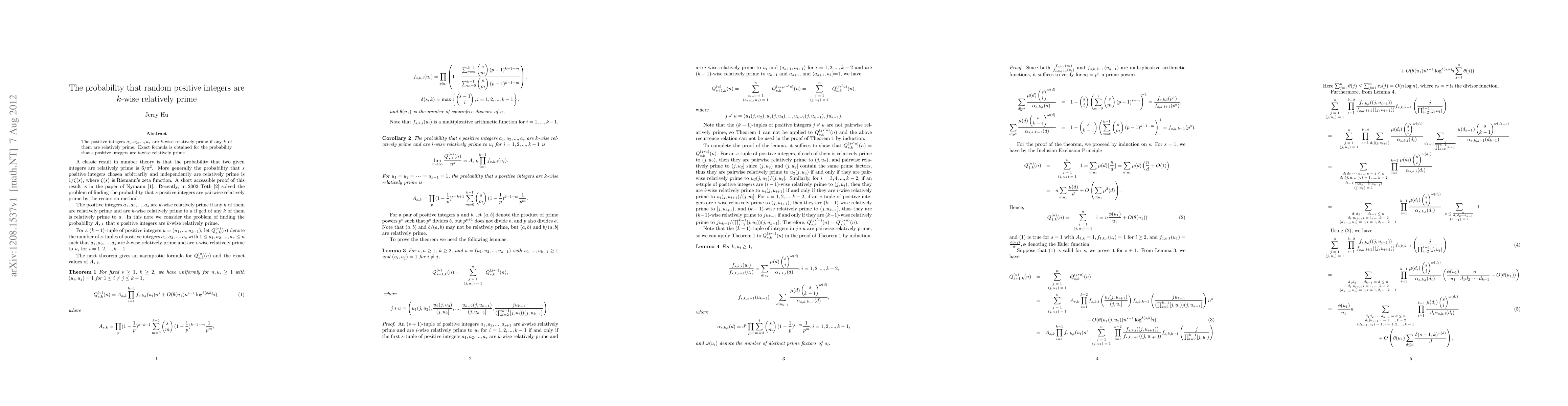 Summary: This paper derives an exact formula for the probability that a set of s positive integers are k-wise relatively prime, meaning any k of them are pairwise coprime. The findings provide a precise mathematical expression for this probabilistic relationship.