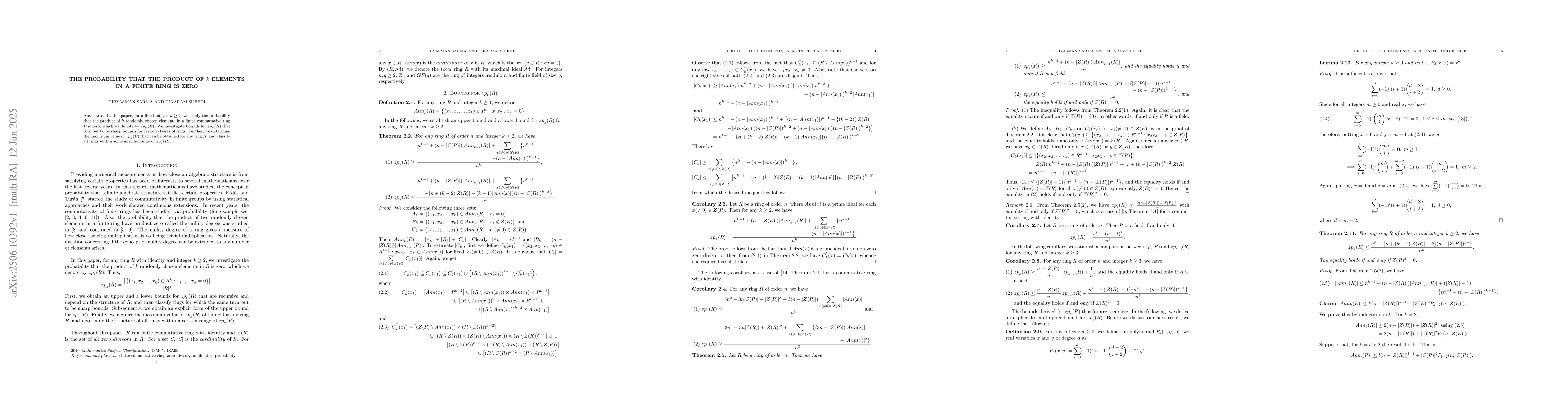 In this paper, for a fixed integer $k\ge 2$, we study the probability that the product of $k$ randomly chosen elements in a finite commutative ring $R$ is zero, which we denote by $zp_{_k}(R)$. We investigate bounds for $zp_{_k}(R)$ that turn out to be sharp bounds for certain classes of rings. Further, we determine the maximum value of $zp_{_k}(R)$ that can be obtained for any ring $R$, and classify all rings within some specific range of $zp_{_k}(R)$.