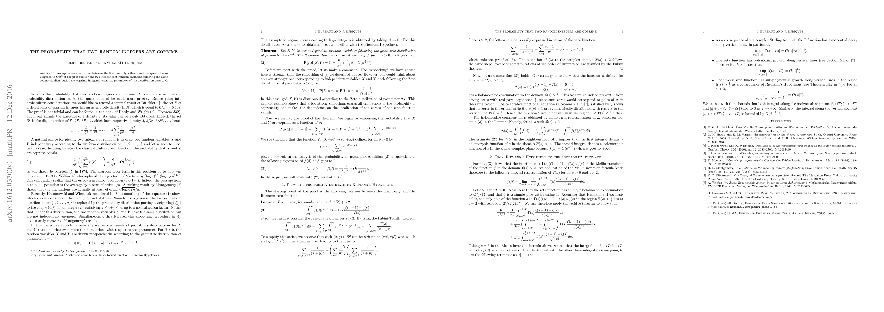 A study links the Riemann Hypothesis to a mathematical concept about random integers being coprime, showing that as one variable approaches zero, certain numbers have a high chance of being coprime.