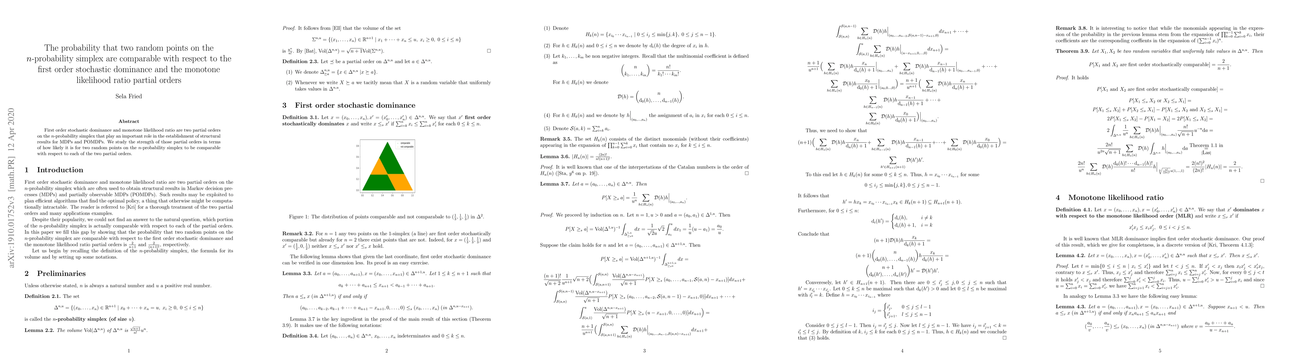 This paper studies how likely it is for two random points on the n-probability simplex to be comparable under first order stochastic dominance and monotone likelihood ratio partial orders.