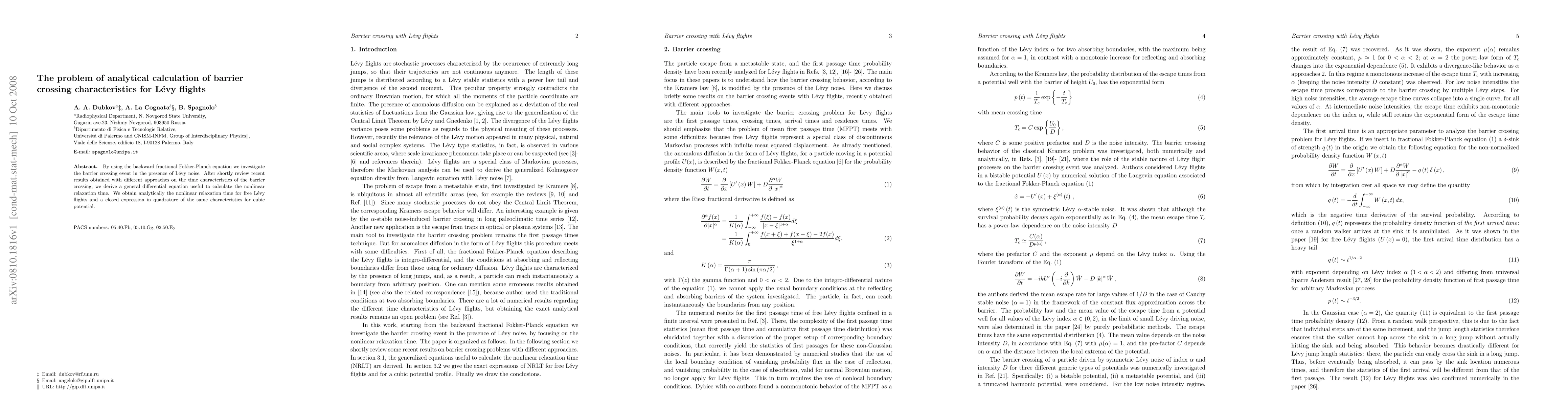 By using the backward fractional Fokker-Planck equation we investigate the barrier crossing event in the presence of Levy noise. After shortly review recent results obtained with different approaches on the time characteristics of the barrier crossing, we derive a general differential equation useful to calculate the nonlinear relaxation time. We obtain analytically the nonlinear relaxation time for free Levy flights and a closed expression in quadrature of the same characteristics for cubic potential.