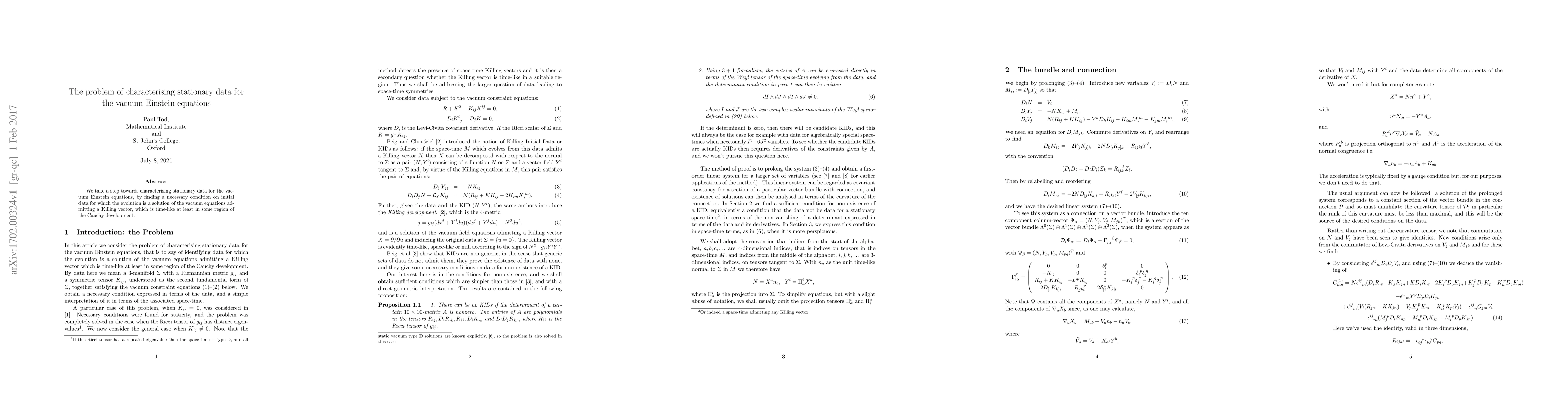 Summary: This paper identifies a necessary condition for initial data that ensures the evolution of the vacuum Einstein equations admits a time-like Killing vector in at least some region, contributing to the characterization of stationary data.