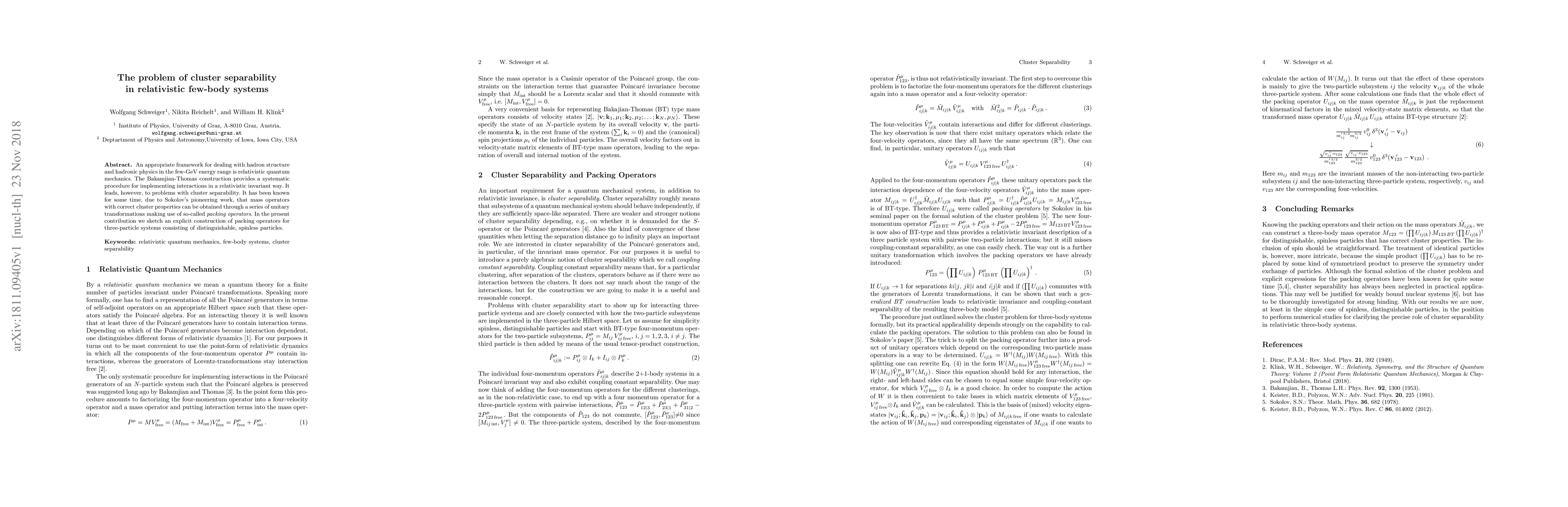 This paper addresses the challenge of cluster separability in relativistic quantum mechanics for few-GeV hadron systems, utilizing the Bakamjian-Thomas construction to implement interactions. It proposes an explicit construction of packing operators for three-particle systems to resolve cluster separability issues.