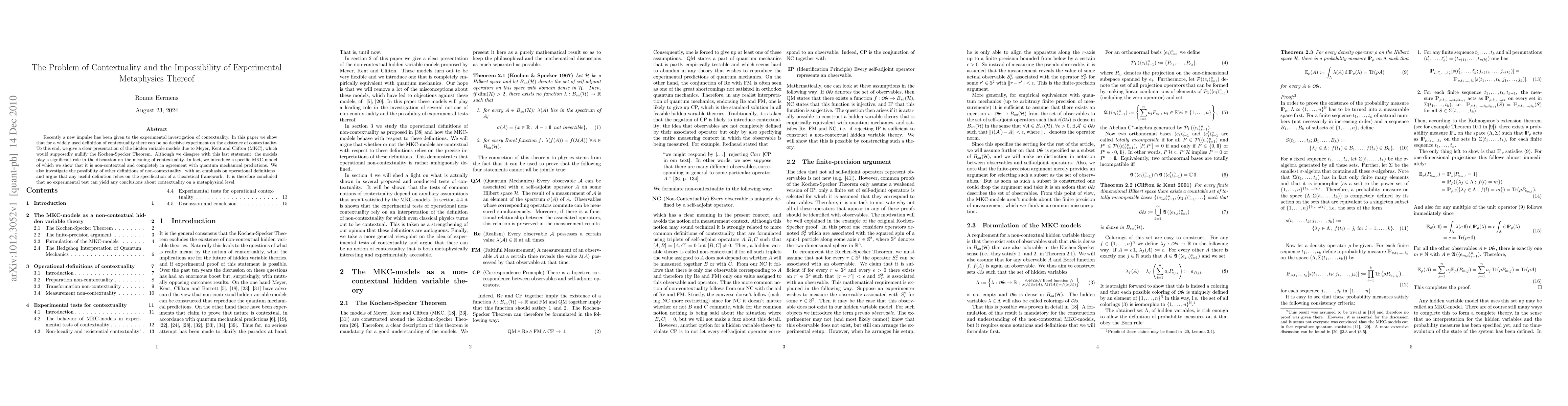 Recently a new impulse has been given to the experimental investigation of contextuality. In this paper we show that for a widely used definition of contextuality there can be no decisive experiment on the existence of contextuality. To this end, we give a clear presentation of the hidden variable models due to Meyer, Kent and Clifton (MKC), which would supposedly nullify the Kochen-Specker Theorem. Although we disagree with this last statement, the models play a significant role in the discussion on the meaning of contextuality. In fact, we introduce a specific MKC-model of which we show that it is non-contextual and completely in agreement with quantum mechanical predictions. We also investigate the possibility of other definitions of non-contextuality --with an emphasis on operational definitions-- and argue that any useful definition relies on the specification of a theoretical framework. It is therefore concluded that no experimental test can yield any conclusions about contextuality on a metaphysical level.