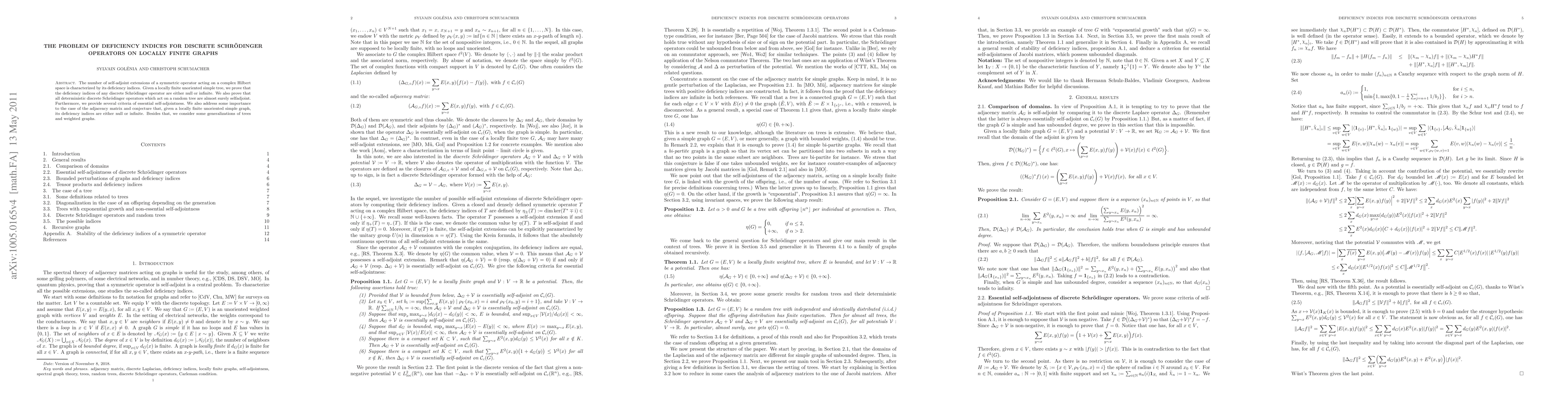This paper investigates the deficiency indices of discrete Schrödinger operators on locally finite graphs, proving they are either null or infinite for trees. It also shows that almost surely, a tree exists where all such operators are essentially self-adjoint, and provides criteria for this property. The study extends to adjacency matrices and conjectures similar behavior for general graphs.