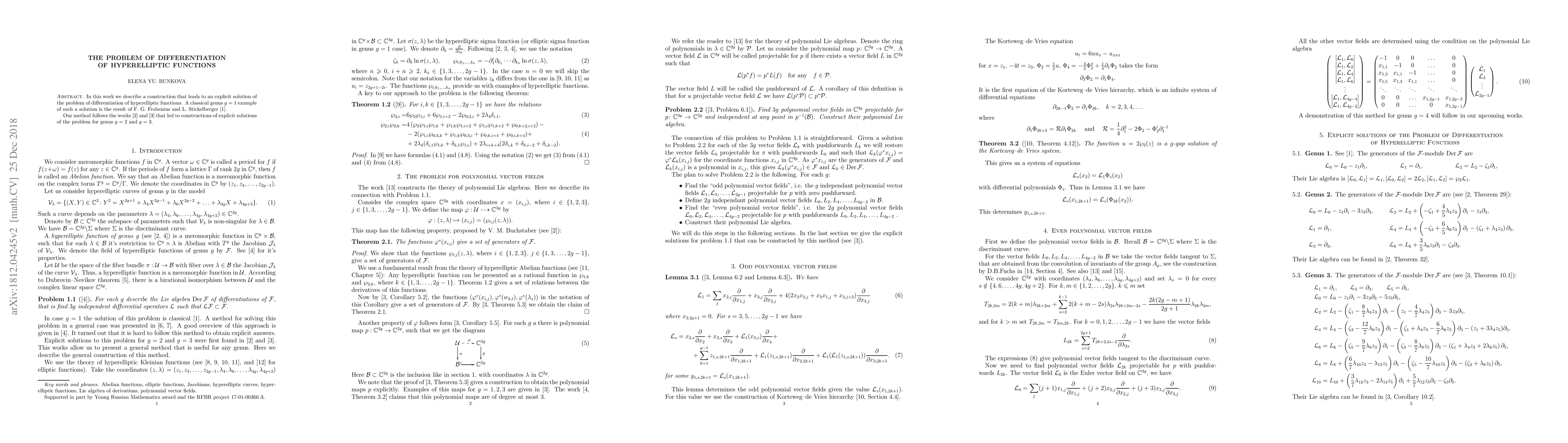 In this work we describe a construction that leads to an explicit solution of the problem of differentiation of hyperelliptic functions. A classical genus $g=1$ example of such a solution is a result of F.G.Frobenius and L.Stickelberger. Our method follows the works that led to constructions of explicit solutions of the problem for genus $g=2$ and $g=3$.