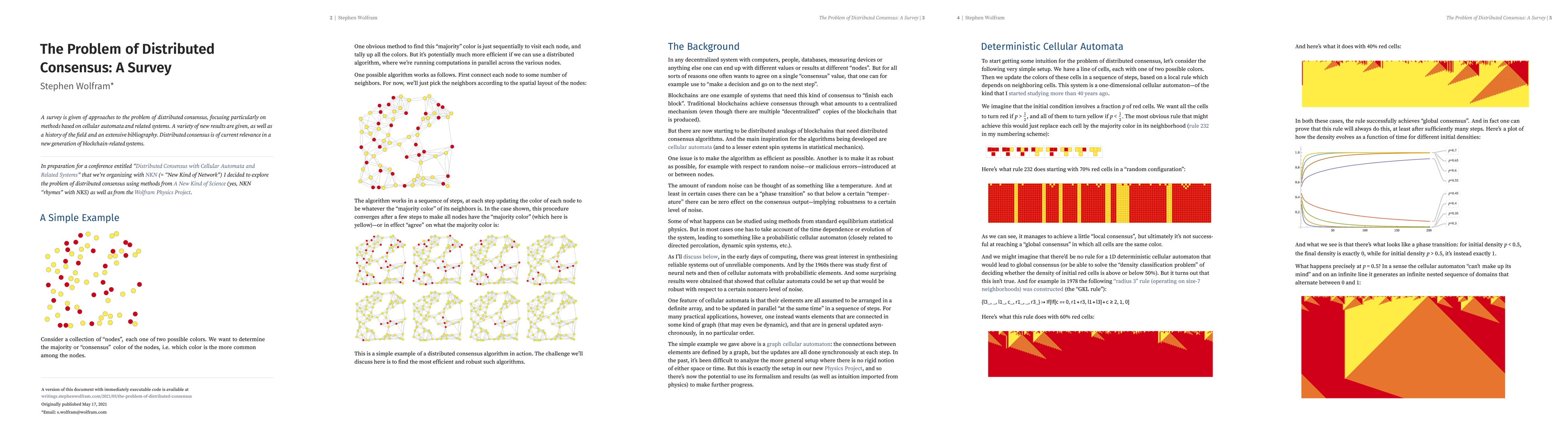 A survey is given of approaches to the problem of distributed consensus, focusing particularly on methods based on cellular automata and related systems. A variety of new results are given, as well as a history of the field and an extensive bibliography. Distributed consensus is of current relevance in a new generation of blockchain-related systems.