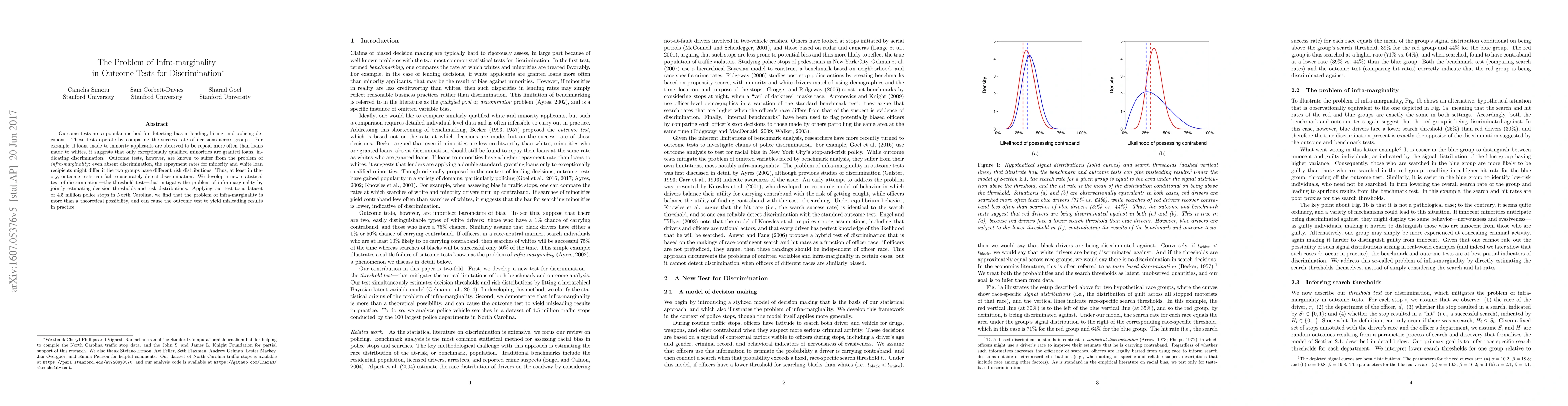 This paper addresses the issue of infra-marginality in outcome tests for discrimination, proposing a new threshold test that jointly estimates decision thresholds and risk distributions to better detect discrimination. The authors demonstrate that traditional outcome tests can yield misleading results due to differing risk distributions, using a dataset of 4.5 million police stops to show practical implications.