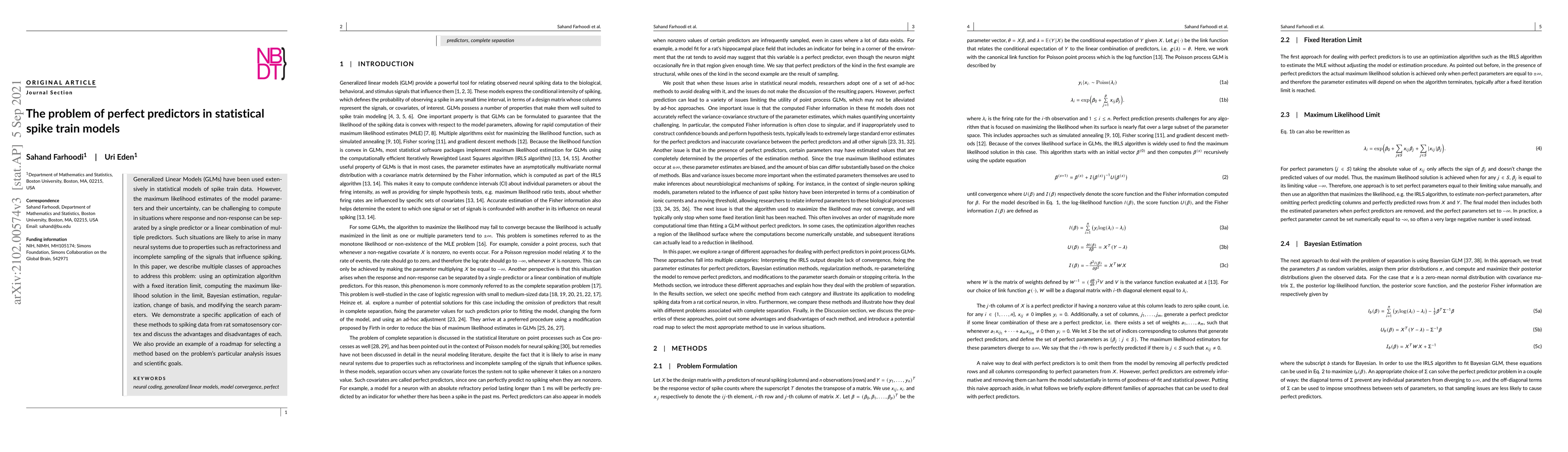This paper addresses a challenge in statistical modeling of neural spike trains: computing maximum likelihood estimates with uncertainty when multiple predictors can separate response and non-response. It proposes several methods to tackle this problem, including optimization algorithms, Bayesian estimation, and regularization.