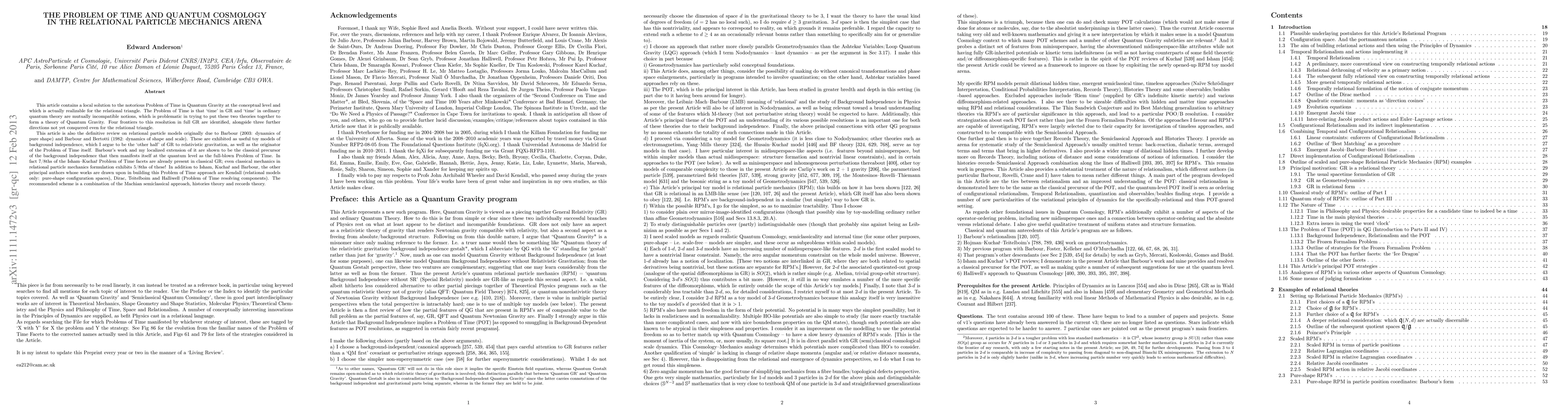 This article contains a local solution to the notorious Problem of Time in Quantum Gravity at the conceptual level and which is actually realizable for the relational triangle. The Problem of Time is that `time' in GR and `time' in ordinary quantum theory are mutually incompatible notions, which is problematic in trying to put these two theories together to form a theory of Quantum Gravity. Four frontiers to this resolution in full GR are identified, alongside three further directions not yet conquered even for the relational triangle. This article is also the definitive review on relational particle models originally due to Barbour (2003: dynamics of pure shape) and Barbour and Bertotti (1982: dynamics of shape and scale). These are exhibited as useful toy models of background independence, which I argue to be the `other half' of GR to relativistic gravitation, as well as the originator of the Problem of Time itself. Barbour's work and my localized extension of it are shown to be the classical precursor of the background independence that then manifests itself at the quantum level as the full-blown Problem of Time. In fact 7/8ths of the Isham--Kuchar Problem of Time facets are already present in classical GR; even classical mechanics in relational particle mechanics formulation exhibits 5/8ths of these! In addition to Isham, Kuchar and Barbour, the other principal authors whose works are drawn upon in building this Problem of Time approach are Kendall (relational models only: pure-shape configuration spaces), Dirac, Teitelboim and Halliwell (Problem of Time resolving components). The recommended scheme is a combination of the Machian semiclassical approach, histories theory and records theory.