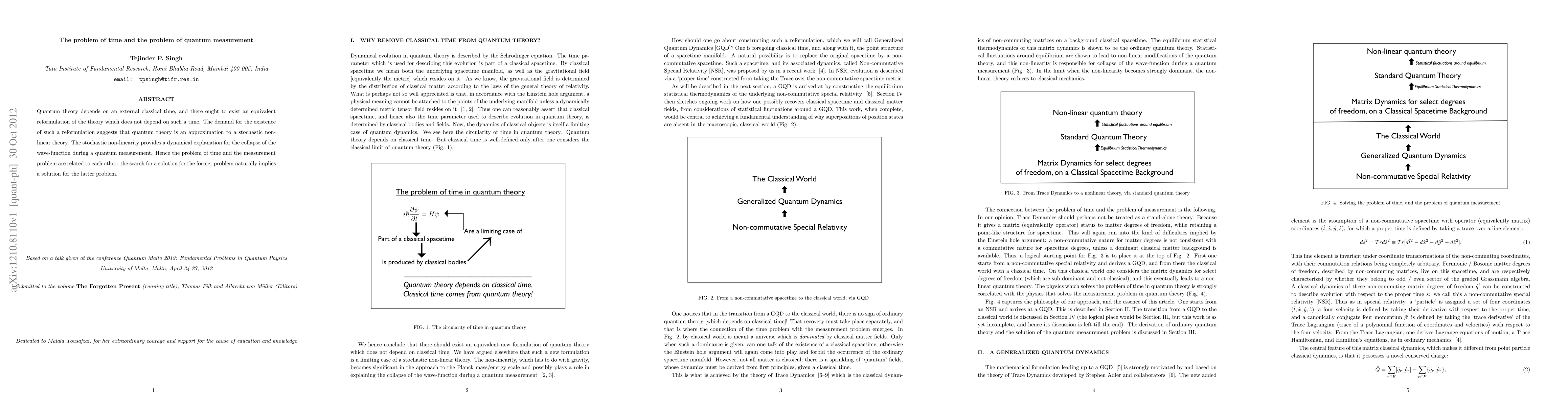 This paper explores the relationship between the problem of time in quantum theory and the quantum measurement problem, suggesting that a reformulation of quantum theory without classical time may lead to a stochastic non-linear theory that naturally explains wave-function collapse during measurement. The solution to the time problem inherently addresses the measurement problem.