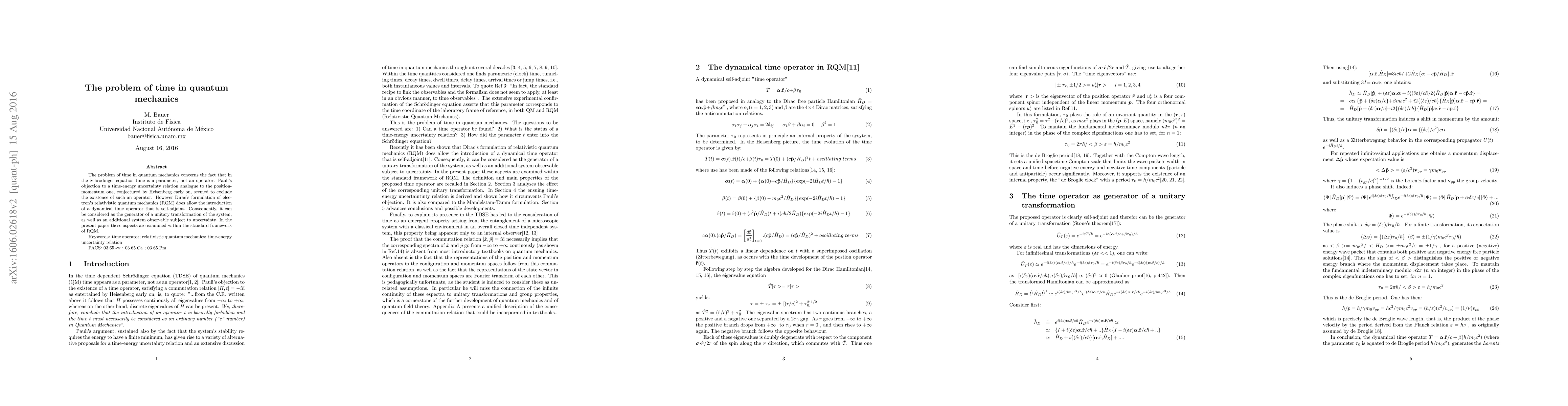 The problem of time in quantum mechanics concerns the fact that in the Schr\"odinger equation time is a parameter, not an operator. Pauli's objection to a time-energy uncertainty relation analogue to the position-momentum one, conjectured by Heisenberg early on, seemed to exclude the existence of such an operator. However Dirac's formulation of electron's relativistic quantum mechanics (RQM) does allow the introduction of a dynamical time operator that is self-adjoint. Consequently, it can be considered as the generator of a unitary transformation of the system,as well as an additional system observable subject to uncertainty. In the present paper these aspects are examined within the standard framework of RQM.