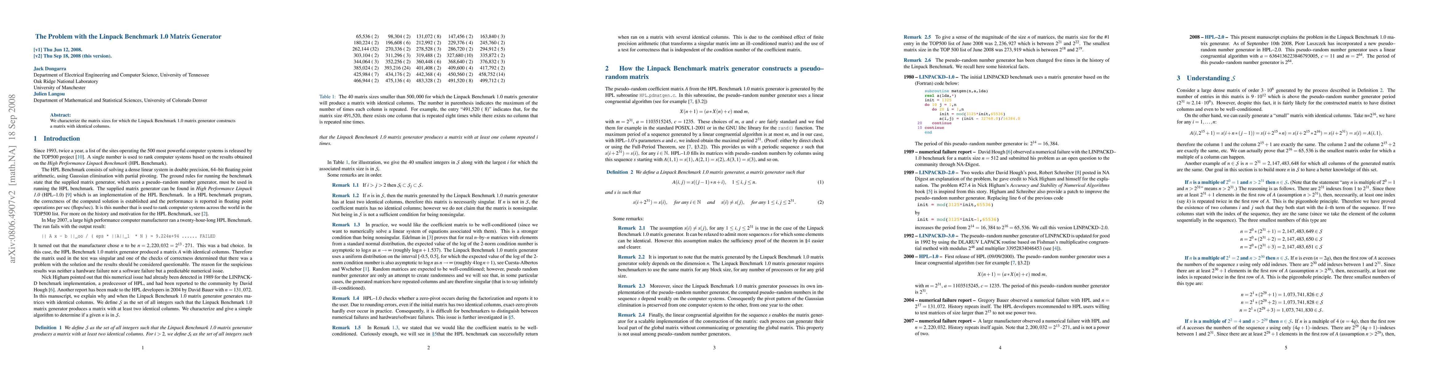 Summary: This paper identifies specific matrix sizes where the Linpack Benchmark matrix generator inadvertently produces matrices with identical columns, highlighting a significant flaw in the benchmark's reliability.