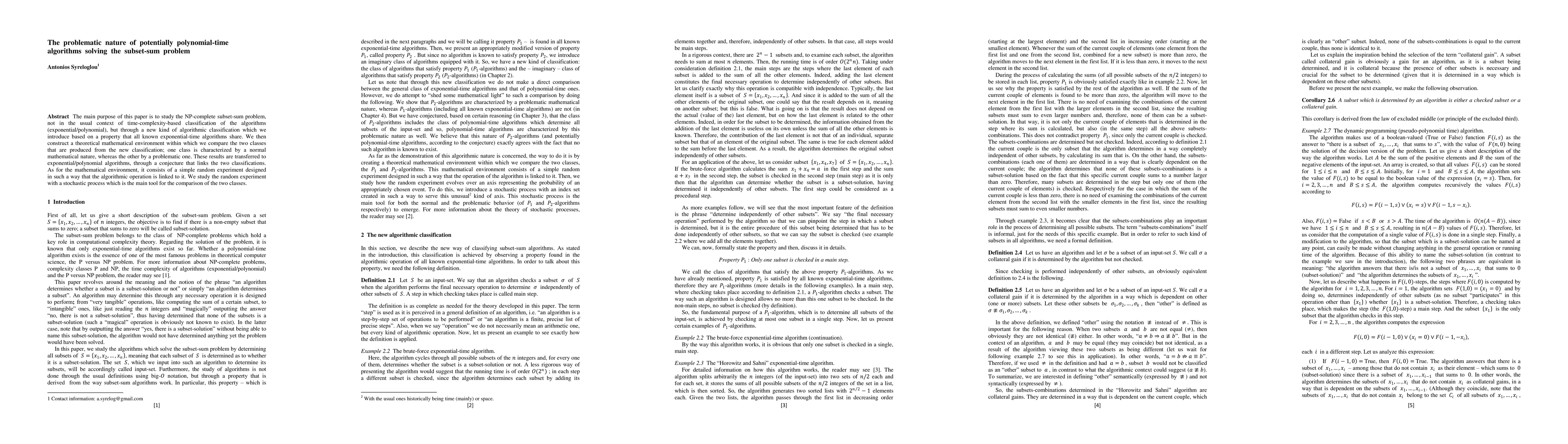 The main purpose of this paper is to study the NP-complete subset-sum problem, not in the usual context of time-complexity-based classification of the algorithms (exponential/polynomial), but through a new kind of algorithmic classification which we introduce based on a property that all known exponential-time algorithms share. We then construct a theoretical mathematical environment within which we compare the two classes that are produced from the new classification; one class is characterized by a normal mathematical nature, whereas the other by a problematic one. These results are transferred to exponential/polynomial algorithms, through a conjecture that links the two classifications. As for the mathematical environment, it consists of a simple random experiment designed in such a way that the algorithmic operation is linked to it. We study the random experiment with a stochastic process which is the main tool for the comparison of the two classes.