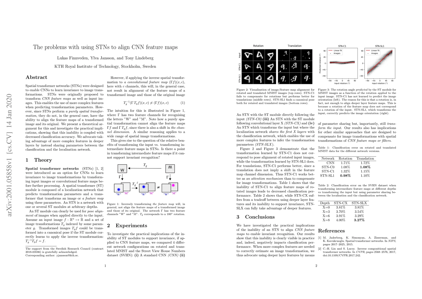 This paper argues that spatial transformer networks (STNs) cannot effectively align CNN feature maps due to their purely spatial transformation nature, leading to decreased classification accuracy. The authors suggest sharing parameters between classification and localization networks to leverage more complex features in deeper layers.