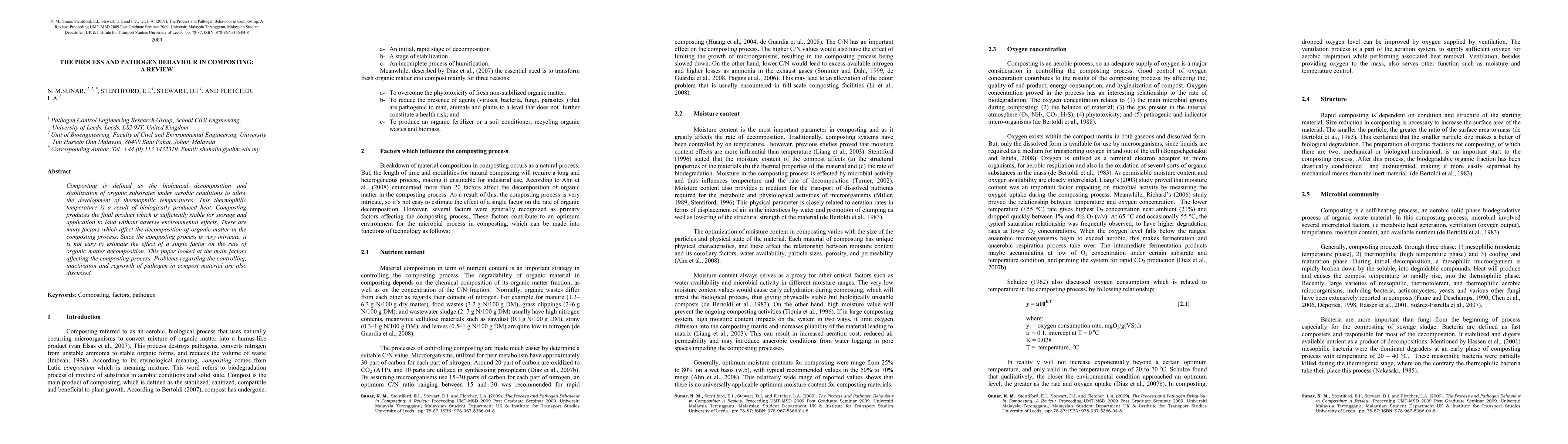 This review examines the intricate composting process, focusing on the biological decomposition of organic substrates under aerobic conditions that generate thermophilic temperatures. It highlights the factors influencing decomposition and discusses challenges related to pathogen control, inactivation, and regrowth in compost.