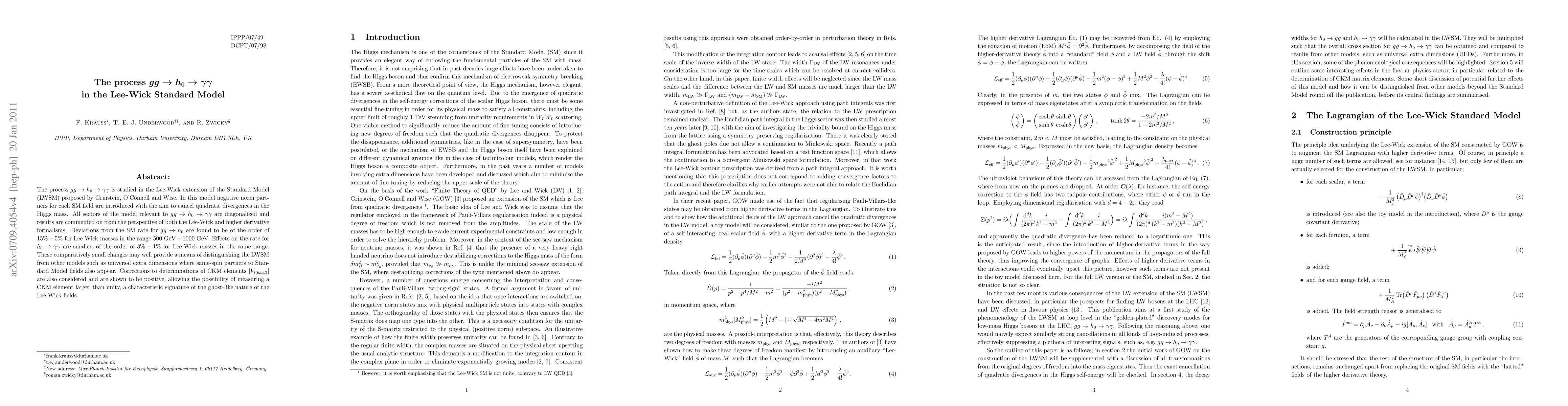 This paper explores the process gg -> h_0 -> gamma gamma in the Lee-Wick Standard Model, finding deviations from the Standard Model rate of about 15% - 5% for Lee-Wick masses between 500GeV and 1000GeV, potentially distinguishing the model from others. It also discusses positive corrections to CKM elements, hinting at a possible measurement of a CKM element larger than unity.