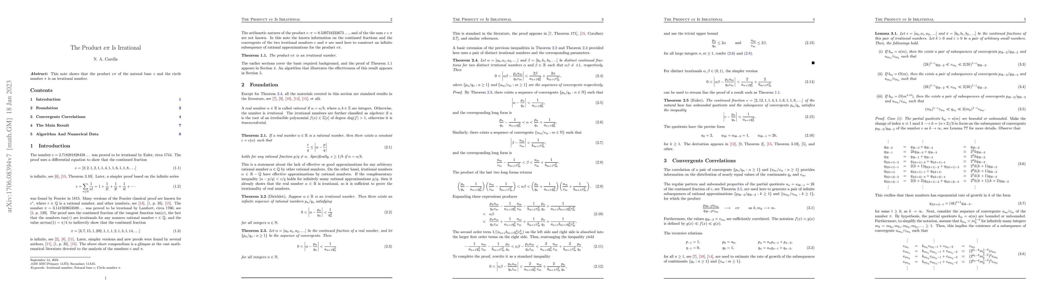 Summary: This paper demonstrates that the product of the mathematical constants $e$ and $\pi$ is irrational, providing a proof that this specific combination of fundamental constants cannot be expressed as a ratio of two integers.