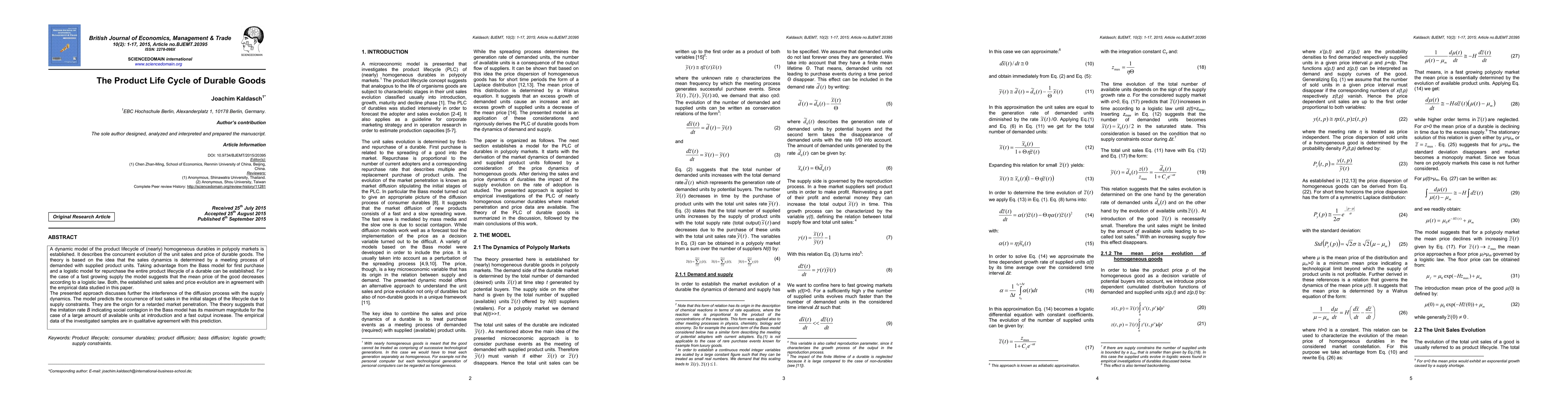 A dynamic model of the product lifecycle of (nearly) homogeneous durables in polypoly markets is established. It describes the concurrent evolution of the unit sales and price of durable goods. The theory is based on the idea that the sales dynamics is determined by a meeting process of demanded with supplied product units. Taking advantage from the Bass model for first purchase and a logistic model for repurchase the entire product lifecycle of a durable can be established. For the case of a fast growing supply the model suggests that the mean price of the good decreases according to a logistic law. Both, the established unit sales and price evolution are in agreement with the empirical data studied in this paper. The presented approach discusses further the interference of the diffusion process with the supply dynamics. The model predicts the occurrence of lost sales in the initial stages of the lifecycle due to supply constraints. They are the origin for a retarded market penetration. The theory suggests that the imitation rate B indicating social contagion in the Bass model has its maximum magnitude for the case of a large amount of available units at introduction and a fast output increase. The empirical data of the investigated samples are in qualitative agreement with this prediction.