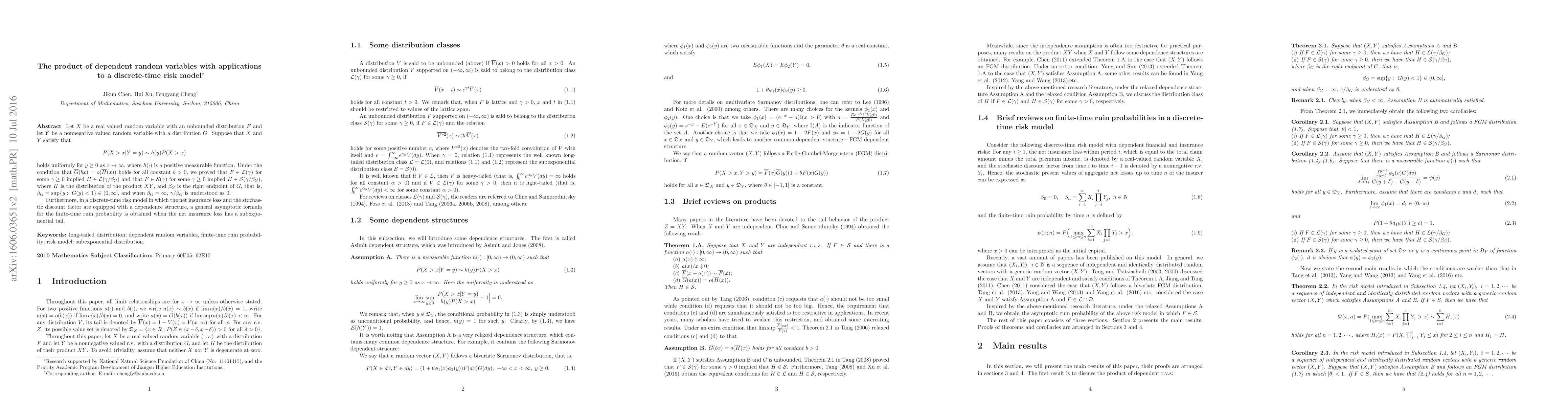 Let $X$ be a real valued random variable with an unbounded distribution $F$ and let $Y$ be a nonnegative valued random variable with a unbounded distribution $G$, which satisfy that \begin{eqnarray*} P(X>x|Y=y)\sim h(y)P(X>x) \end{eqnarray*} holds uniformly for $y\geq0$ as $x\to \infty$. Under the condition that $\overline{G}(bx)=o(\overline H(x))$ holds for all constant $b>0$, we proved that $F\in\mathcal{L}(\gamma)$ for some $\gamma\geq 0$ implied $H\in \mathcal{L}(\gamma/\beta_G)$ and that $F\in\mathcal{S}(\gamma)$ for some $\gamma\geq 0$ implied $H\in \mathcal{S}(\gamma/\beta_G)$, where $H$ is the distribution of the product $XY$, and $\beta_G$ is the right endpoint of $G$, that is, $\beta_G=\sup\{y:~G(y)<1\}\in (0,\infty],$ and when $\beta_G=\infty$, $\gamma/\beta_G$ is understood as 0. Furthermore, in a discrete-time risk model in which the net insurance loss and the stochastic discount factor are equipped with a dependence structure, a general asymptotic formula for the finite-time ruin probability is obtained when the net insurance loss has a subexponential tail.