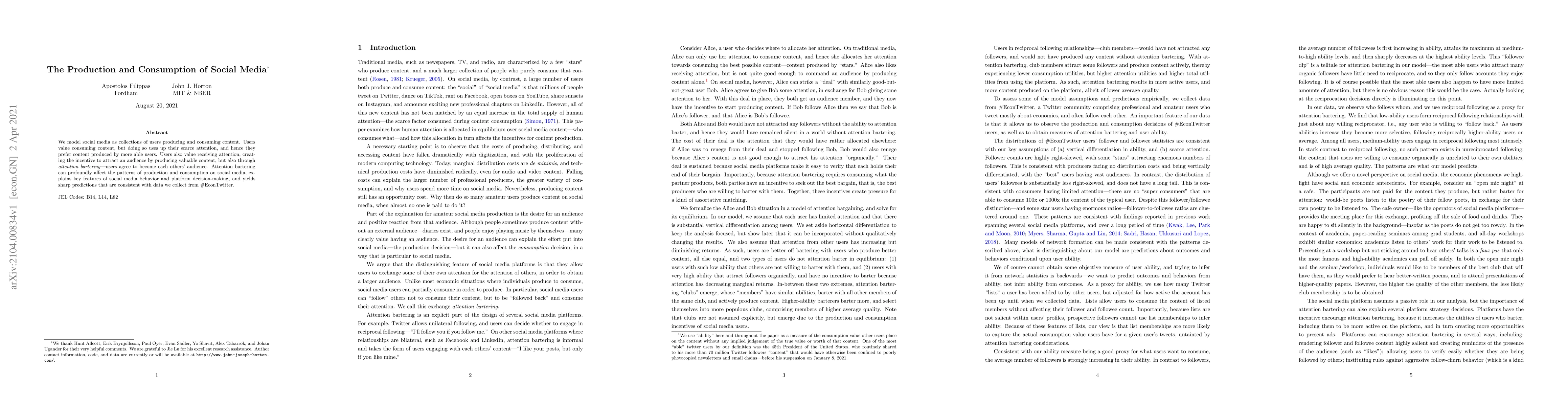 This paper models social media as a system where users both produce and consume content, highlighting the trade-off between attention and content value. It explores how attention bartering influences production and consumption patterns, providing insights into social media behavior and platform strategies.
