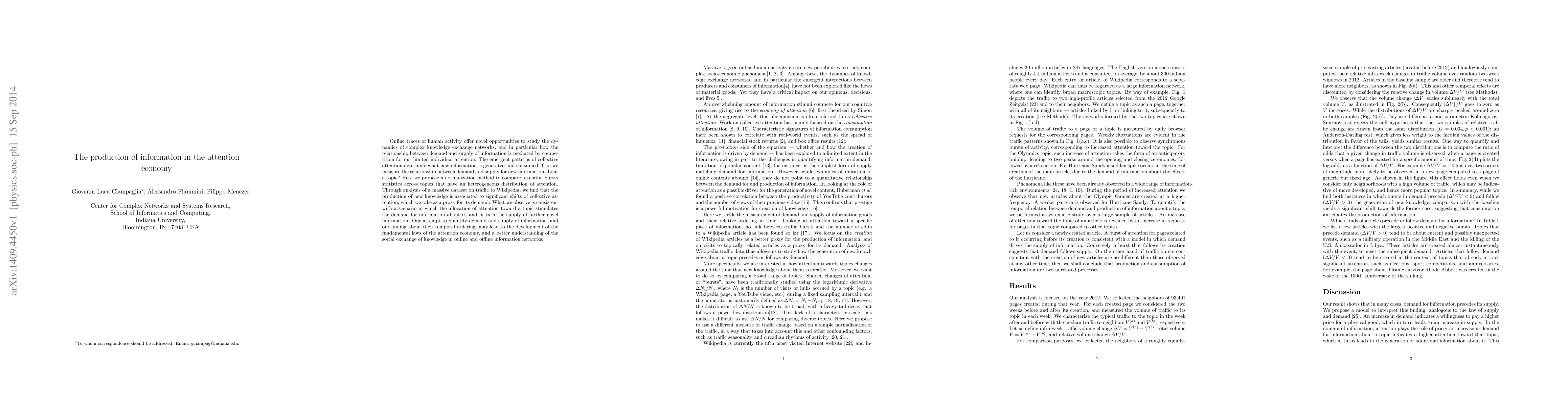 Online traces of human activity offer novel opportunities to study the dynamics of complex knowledge exchange networks, and in particular how the relationship between demand and supply of information is mediated by competition for our limited individual attention. The emergent patterns of collective attention determine what new information is generated and consumed. Can we measure the relationship between demand and supply for new information about a topic? Here we propose a normalization method to compare attention bursts statistics across topics that have an heterogeneous distribution of attention. Through analysis of a massive dataset on traffic to Wikipedia, we find that the production of new knowledge is associated to significant shifts of collective attention, which we take as a proxy for its demand. What we observe is consistent with a scenario in which the allocation of attention toward a topic stimulates the demand for information about it, and in turn the supply of further novel information. Our attempt to quantify demand and supply of information, and our finding about their temporal ordering, may lead to the development of the fundamental laws of the attention economy, and a better understanding of the social exchange of knowledge in online and offline information networks.