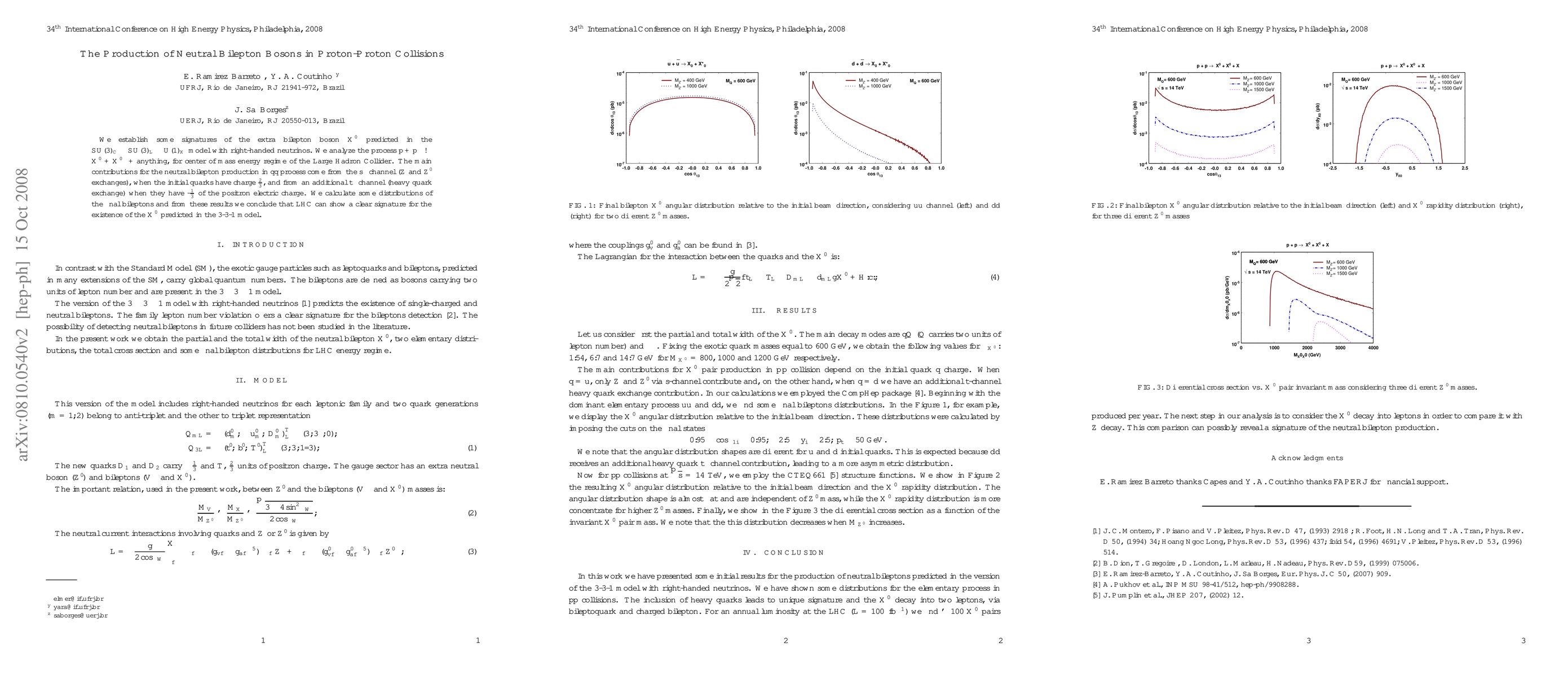 We establish some signatures of the extra bilepton boson ${X^0}$ predicted in the ${SU (3)_C \times SU (3)_L \times U (1)_X}$ model with right-handed neutrinos. We analyze the process $p + p \longrightarrow X^0 +X^{0*} + {\hbox {anything}}$, for center of mass energy regime of the Large Hadron Collider. The main contributions for the neutral bilepton production in $q \bar q$ process come from the $s-$channel ($Z$ and $Z^\prime$ exchanges), when the initial quarks have charge 2/3, and from an additional $t-$channel (heavy quark exchange) when they have -1/3 of the positron electric charge. We calculate some distributions of the final bileptons and from these results we conclude that LHC can show a clear signature for the existence of the $X^0$ predicted in the 3-3-1 model.