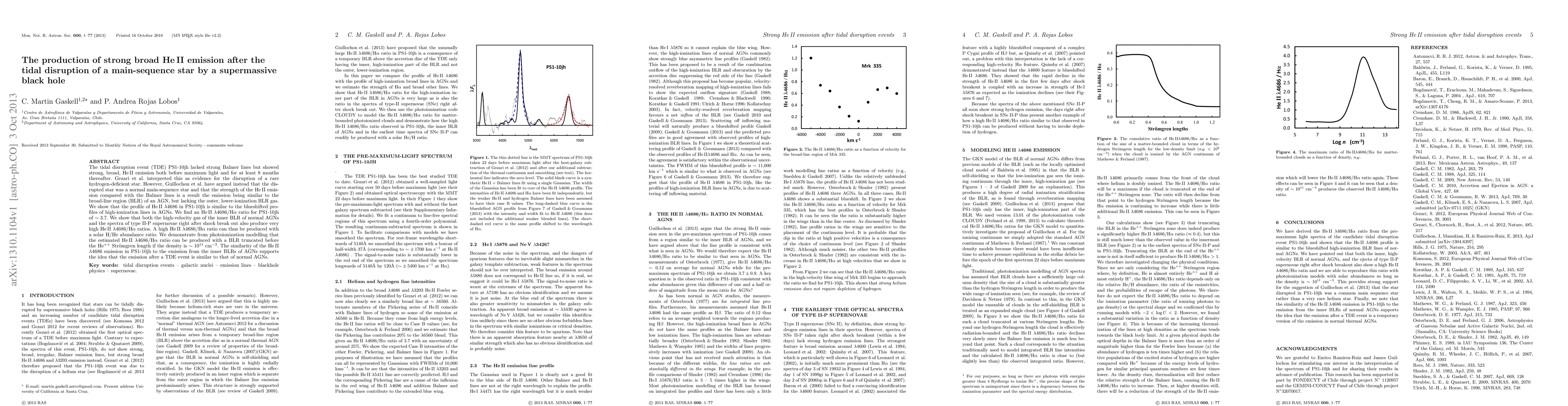 The tidal disruption event (TDE) PS1-10jh lacked strong Balmer lines but showed strong, broad, He II emission both before maximum light and for at least 8 months thereafter. Gezari et al. interpreted this as evidence for the disruption of a rare hydrogen-deficient star. However, Guillochon et al. have argued instead that the disrupted star was a normal main-sequence star and that the strength of the He II emission compared with the Balmer lines is a result the emission being similar to the broad-line region (BLR) of an AGN, but lacking the outer, lower-ionization BLR gas. We show that the profile of He II 4686 in PS1-10jh is similar to the blueshifted profiles of high-ionization lines in AGNs. We find an He II 4686/Halpha ratio for PS1-10jh of ~ 3.7. We show that both the high-velocity gas of the inner BLR of normal AGNs and the spectra of type II-P supernovae right after shock break out also produce very high He II 4686/Halpha ratios. A high He II 4686/Halpha ratio can thus be produced with a solar H/He abundance ratio. We demonstrate from photoionization modelling that the estimated He II 4686/Halpha ratio can be produced with a BLR truncated before the He++ Stroemgren length if the density is ~ 10^{11} cm^{-3}. The similarity of the He II 4686 emission in PS1-10jh to the emission from the inner BLRs of AGNs supports the idea that the emission after a TDE event is similar to that of normal AGNs.