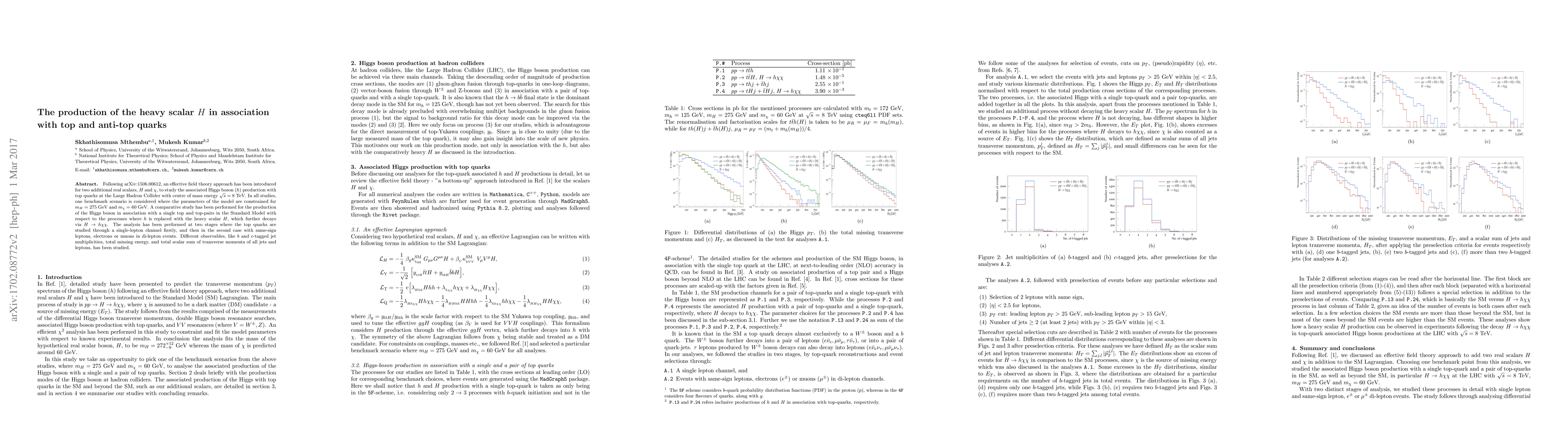 Following arXiv:1506.00612, an effective field theory approach has been introduced for two additional real scalars, $H$ and $\chi$, to study the associated Higgs boson ($h$) production with top quarks at the Large Hadron Collider with centre of mass energy $\sqrt s = 8$ TeV. In all studies, one benchmark scenario is considered where the parameters of the model are constrained for $m_H = 275$ GeV and $m_\chi = 60$ GeV. A comparative study has been performed for the production of the Higgs boson in association with a single top and top-pairs in the Standard Model with respect to the processes where $h$ is replaced with the heavy scalar $H$, which further decays via $H \to h \chi\chi$. The analysis has been performed at two stages where the top quarks are studied through a single-lepton channel firstly, and then in the second case with same-sign leptons, electrons or muons in di-lepton events. Different observables, like $b$ and $c$-tagged jet multiplicities, total missing energy, and total scalar sum of transverse momenta of all jets and leptons, has been studied.
