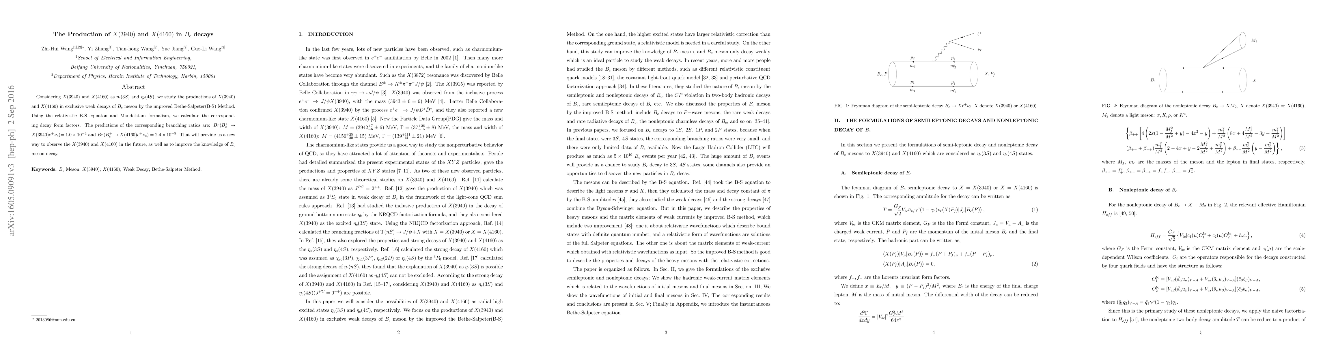 This paper investigates the production of $X(3940)$ and $X(4160)$ in $B_c$ meson decays using the improved Bethe-Salpeter Method, identifying them as $\eta_c(3S)$ and $\eta_c(4S)$. The study predicts branching ratios of $1.0\times10^{-4}$ for $B_c^+\to X(3940)e^+\nu_e$ and $2.4\times10^{-5}$ for $B_c^+\to X(4160)e^+\nu_e$.