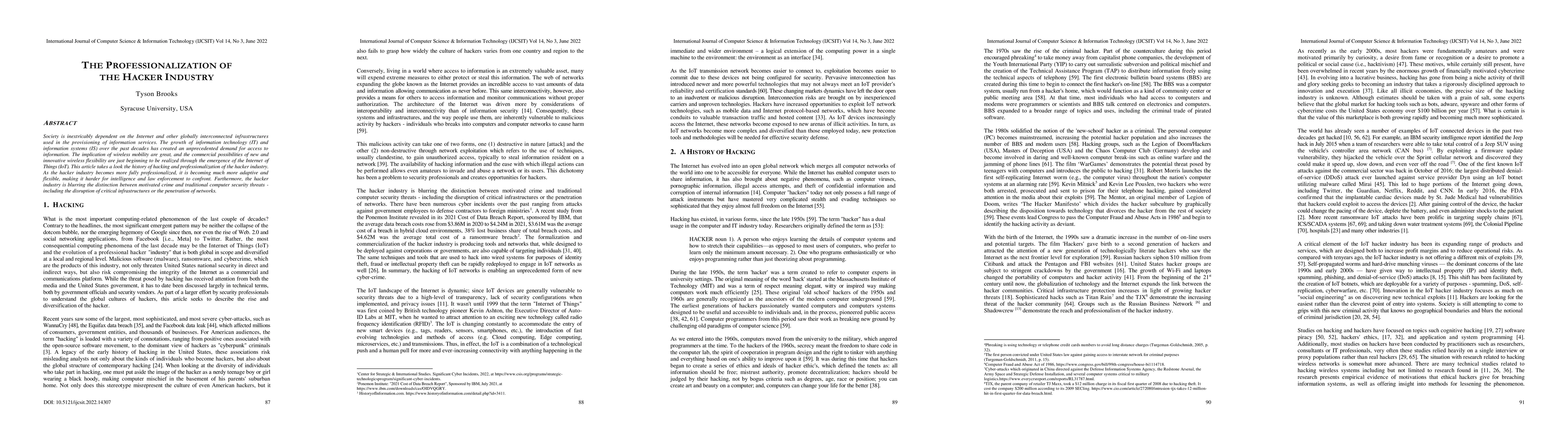 Society is inextricably dependent on the Internet and other globally interconnected infrastructures used in the provisioning of information services. The growth of information technology (IT) and information systems (IS) over the past decades has created an unprecedented demand for access to information. The implication of wireless mobility are great, and the commercial possibilities of new and innovative wireless flexibility are just beginning to be realized through the emergence of the Internet of Things (IoT). This article takes a look the history of hacking and professionalization of the hacker industry. As the hacker industry becomes more fully professionalized, it is becoming much more adaptive and flexible, making it harder for intelligence and law enforcement to confront. Furthermore, the hacker industry is blurring the distinction between motivated crime and traditional computer security threats - including the disruption of critical infrastructures or the penetration of networks.