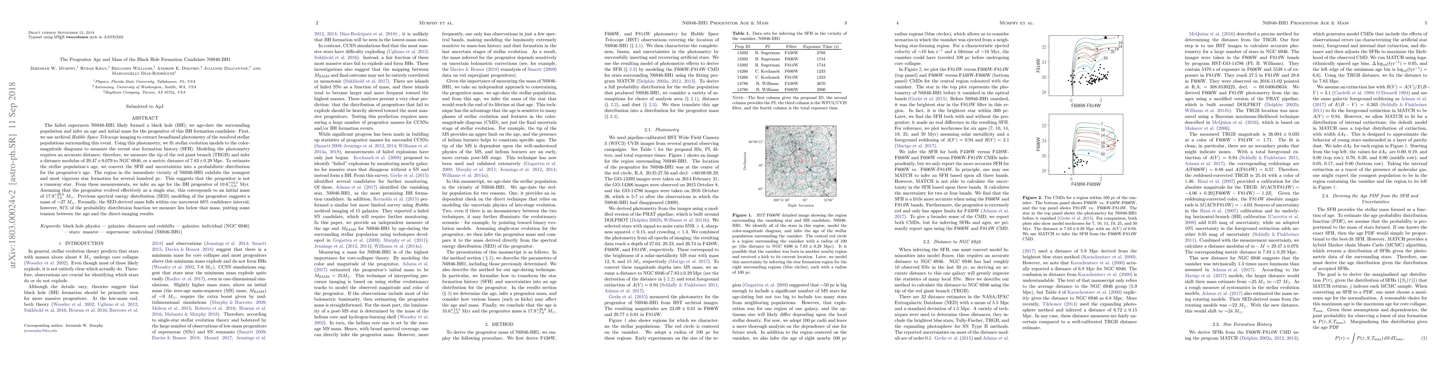 The research uses Hubble Space Telescope imaging to extract broadband photometry of resolved stellar populations surrounding the black-hole-formation candidate N6946-BH1. Stellar evolution models are fitted to color-magnitude diagrams to measure the recent star formation history (SFH), with a distance modulus of $29.47 \pm 0.079$ inferred from the tip of the red giant branch (TRGB). A probabilistic distribution for the progenitor's age is estimated from the SFH and uncertainties.