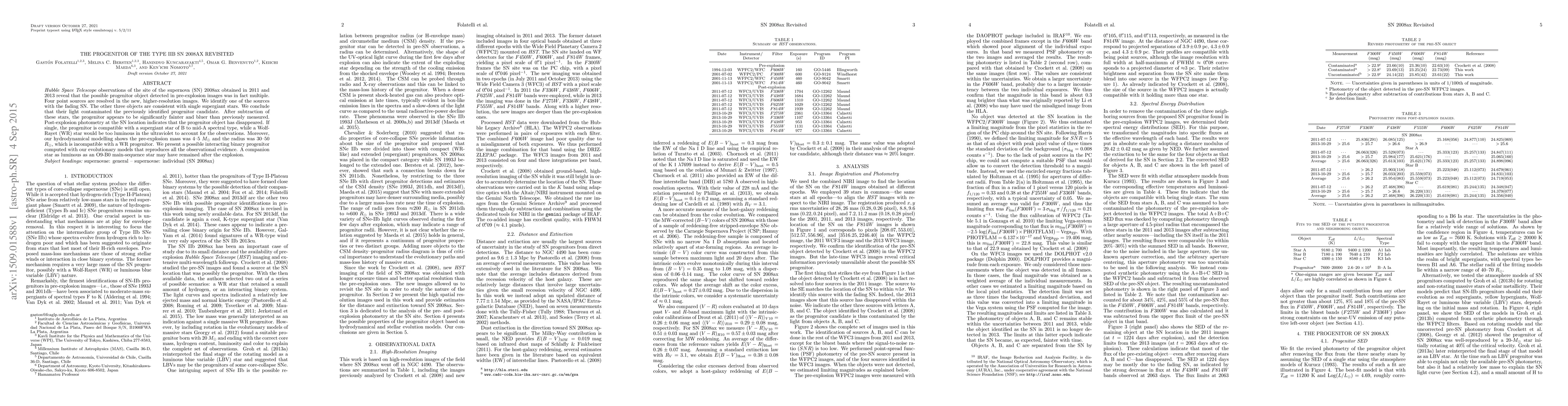 The Hubble Space Telescope observations of SN 2008ax's site in 2011 and 2013 reveal the initial progenitor identification was incorrect due to light contamination from three nearby supergiant stars. After removing their contribution, the true progenitor is found to be fainter and bluer, indicating a B to mid-A spectral type supergiant, not a Wolf-Rayet star. Hydrodynamical modeling suggests a pre-explosion mass of 4-5 solar masses and radius of 30-50 solar radii, incompatible with a Wolf-Rayet progenitor. The study proposes a possible interacting binary progenitor system, with a companion star potentially surviving the explosion.