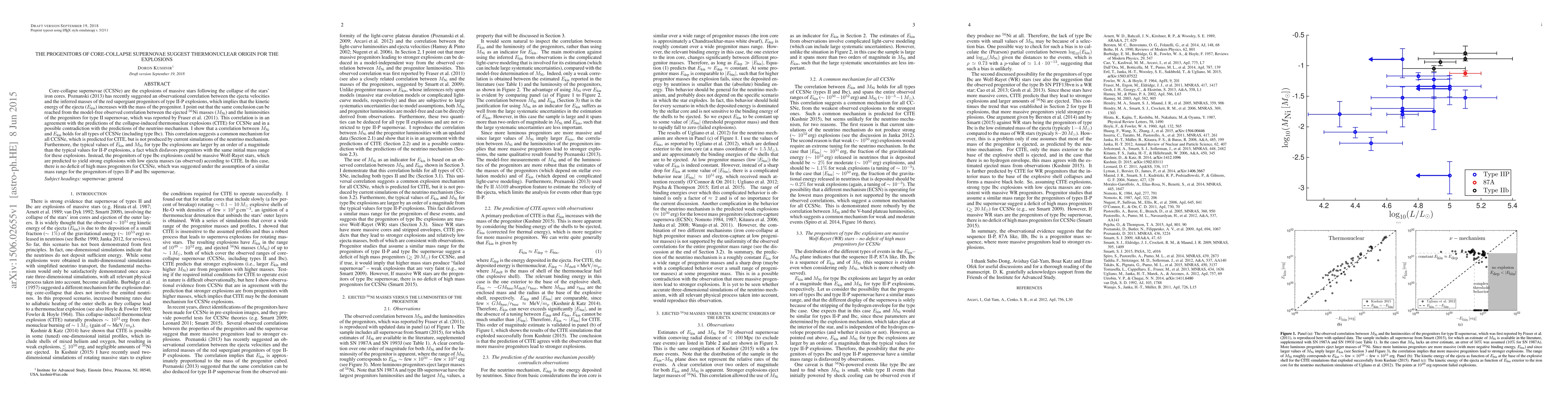 Core-collapse supernovae (CCSNe) are the explosions of massive stars following the collapse of the stars' iron cores. Poznanski (2013) has recently suggested an observational correlation between the ejecta velocities and the inferred masses of the red supergiant progenitors of type II-P explosions, which implies that the kinetic energy of the ejecta ($E_{\textrm{kin}}$) increases with the mass of the progenitor. I point out that the same conclusion can be reached from the model-free observed correlation between the ejected $^{56}$Ni masses ($M_{\textrm{Ni}}$) and the luminosities of the progenitors for type II supernovae, which was reported by Fraser et al. (2011). This correlation is in an agreement with the predictions of the collapse-induced thermonuclear explosions (CITE) for CCSNe and in a possible contradiction with the predictions of the neutrino mechanism. I show that a correlation between $M_{\textrm{Ni}}$ and $E_{\textrm{kin}}$ holds for all types of CCSNe (including type Ibc). This correlation suggests a common mechanism for all CCSNe, which is predicted for CITE, but is not produced by current simulations of the neutrino mechanism. Furthermore, the typical values of $E_{\textrm{kin}}$ and $M_{\textrm{Ni}}$ for type Ibc explosions are larger by an order of a magnitude than the typical values for II-P explosions, a fact which disfavors progenitors with the same initial mass range for these explosions. Instead, the progenitors of type Ibc explosions could be massive Wolf-Rayet stars, which are predicted to yield strong explosions with low ejecta masses (as observed) according to CITE. In this case, there is no deficit of high mass progenitors for CCSNe, which was suggested under the assumption of a similar mass range for the progenitors of types II-P and Ibc supernovae.