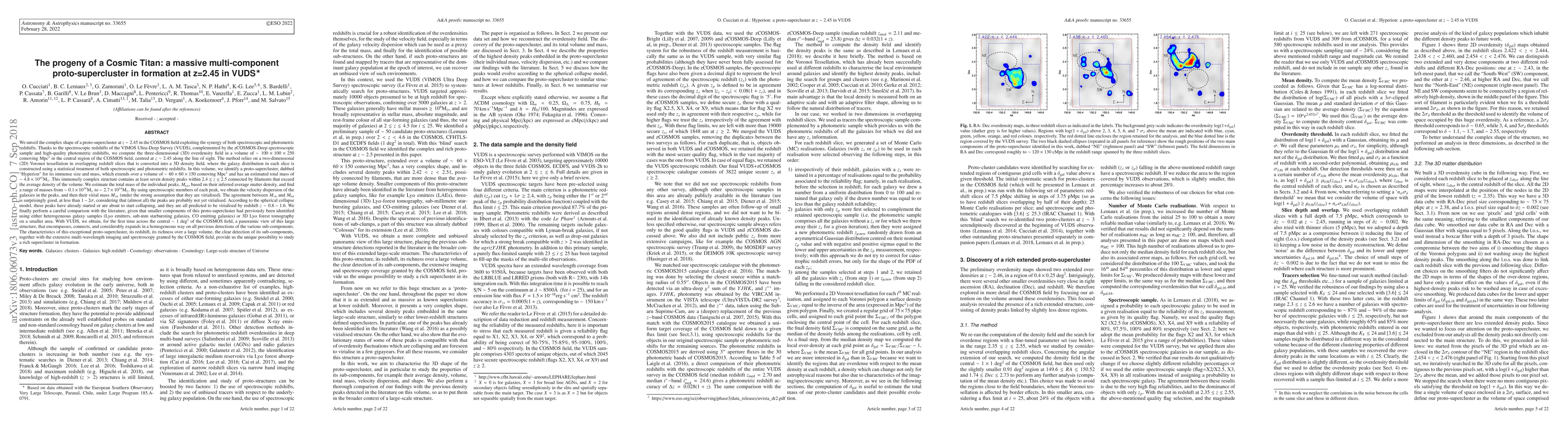 This paper identifies a massive proto-supercluster, "Hyperion," at z=2.45 in the COSMOS field, using VUDS and zCOSMOS-Deep data. The structure spans ~60x60x150 comoving Mpc^3 and contains at least 7 density peaks, predicting they will virialize by z~0.8-1.6.