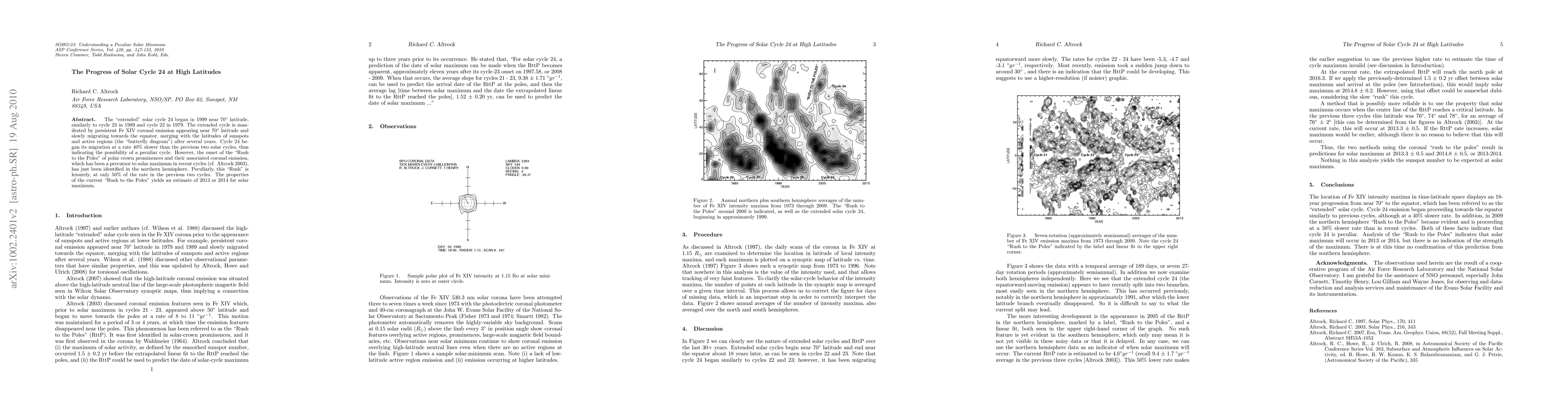 The "extended" solar cycle 24 began in 1999 near 70 degrees latitude, similarly to cycle 23 in 1989 and cycle 22 in 1979. The extended cycle is manifested by persistent Fe XIV coronal emission appearing near 70 degrees latitude and slowly migrating towards the equator, merging with the latitudes of sunspots and active regions (the "butterfly diagram") after several years. Cycle 24 began its migration at a rate 40% slower than the previous two solar cycles, thus indicating the possibility of a peculiar cycle. However, the onset of the "Rush to the Poles" of polar crown prominences and their associated coronal emission, which has been a precursor to solar maximum in recent cycles (cf. Altrock 2003), has just been identified in the northern hemisphere. Peculiarly, this "Rush" is leisurely, at only 50% of the rate in the previous two cycles. The properties of the current "Rush to the Poles" yields an estimate of 2013 or 2014 for solar maximum.