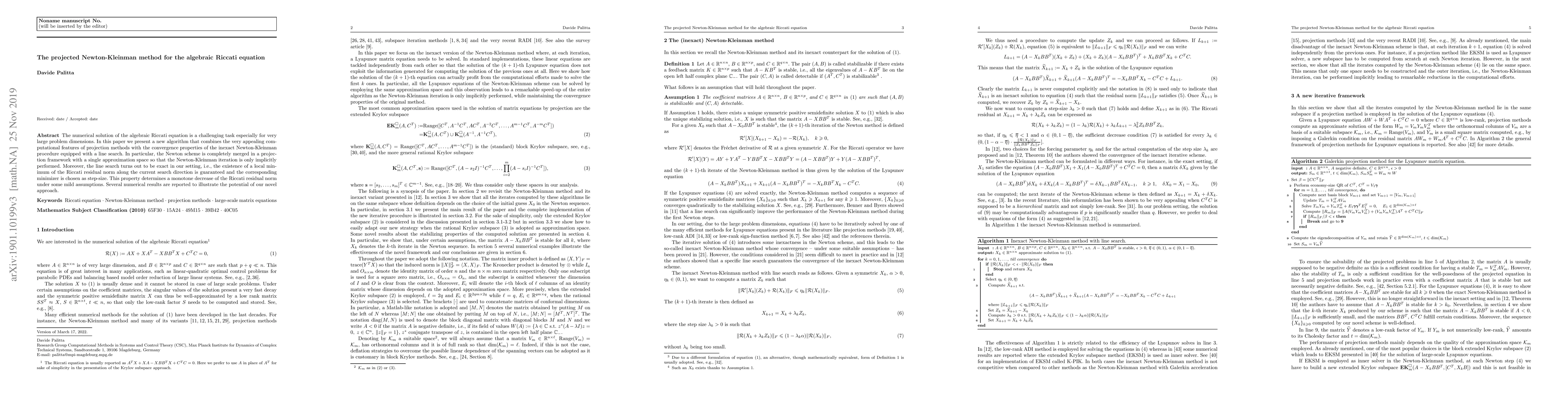 The numerical solution of the algebraic Riccati equation is a challenging task especially for very large problem dimensions. In this paper we present a new algorithm that combines the very appealing computational features of projection methods with the convergence properties of the inexact Newton-Kleinman procedure equipped with a line search. In particular, the Newton scheme is completely merged in a projection framework with a single approximation space so that the Newton-Kleinman iteration is only implicitly performed. Moreover, the line search turns out to be exact in our setting, i.e., the existence of a local minimum of the Riccati residual norm along the current search direction is guaranteed and the corresponding minimizer is chosen as step-size. This property determines a monotone decrease of the Riccati residual norm under some mild assumptions. Several numerical results are reported to illustrate the potential of our novel approach.