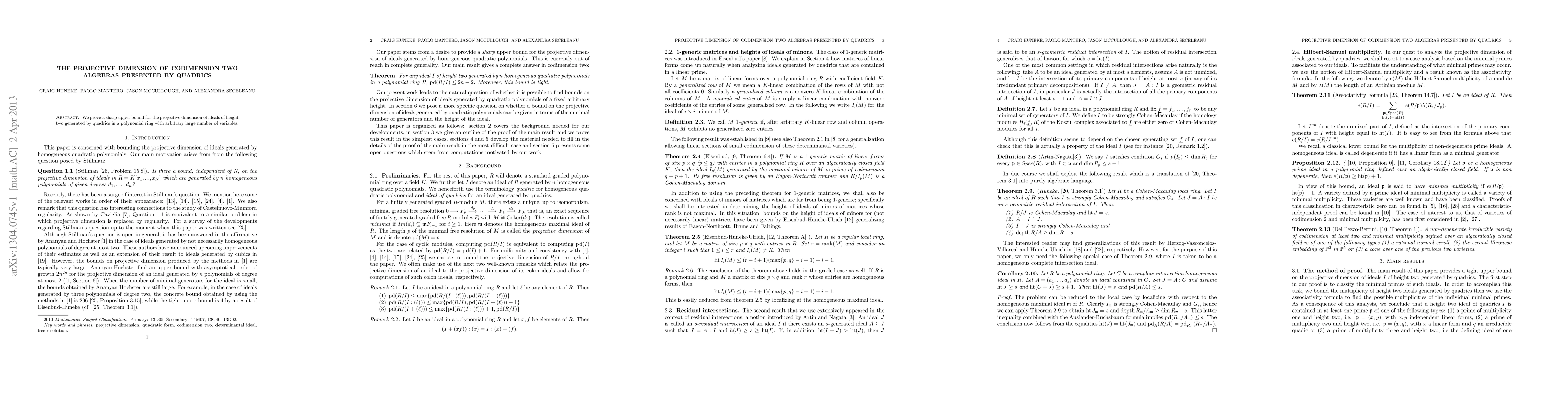 Summary: This paper establishes a precise upper limit for the projective dimension of codimension two algebras formed by ideals generated by quadrics in polynomial rings with an extensive number of variables. The result provides a sharp bound for these dimensions.