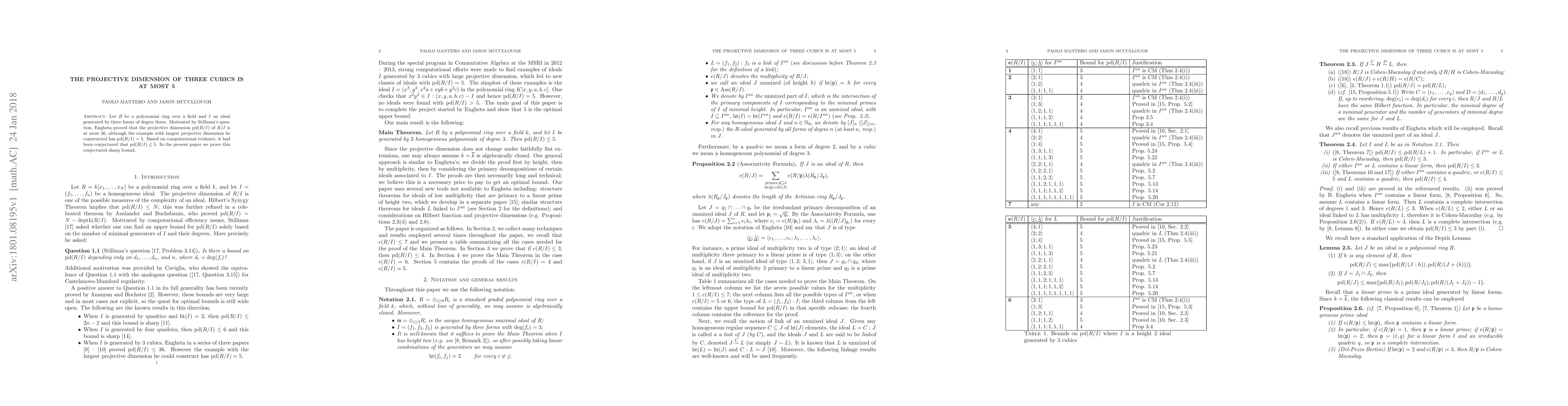 This paper proves that the projective dimension of a polynomial ring modulo an ideal generated by three cubic forms is at most 5, confirming a long-standing conjecture based on computational evidence. The result builds on previous work by Engheta, who established an upper bound of 36.