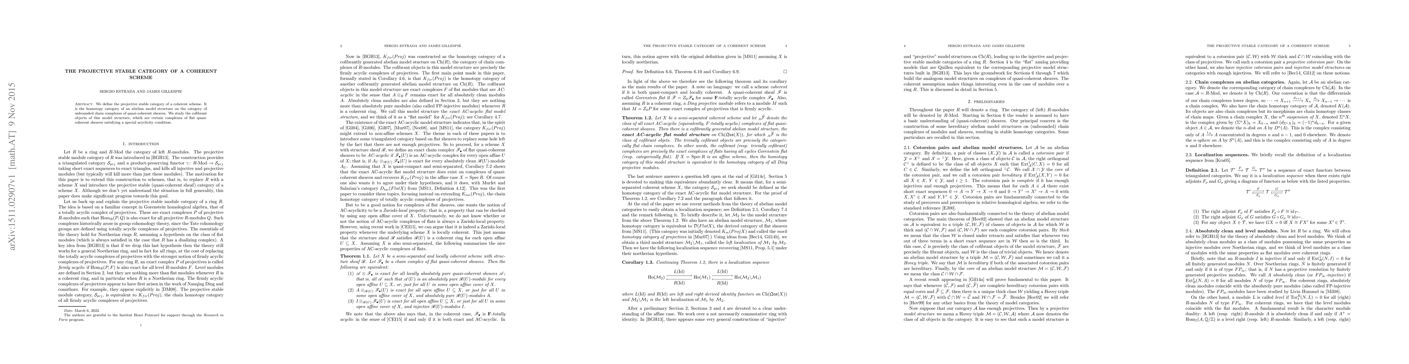 Summary: This paper introduces the projective stable category of a coherent scheme, defined as the homotopy category of an abelian model structure on unbounded chain complexes of quasi-coherent sheaves, and investigates the cofibrant objects, which are specific acyclic flat quasi-coherent sheaves.