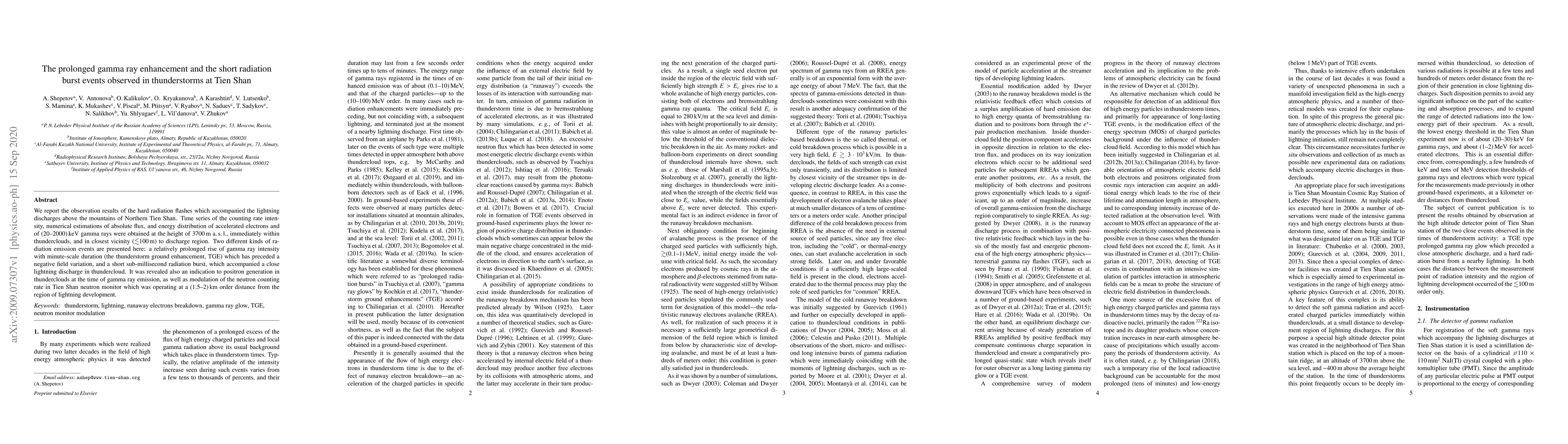 This paper reports observations of hard radiation flashes accompanying lightning discharges in Northern Tien Shan thunderstorms, identifying two types of radiation events: prolonged gamma ray enhancements preceding negative field variations and short sub-millisecond bursts accompanying lightning. It also indicates positron generation and neutron modulation in nearby monitors.