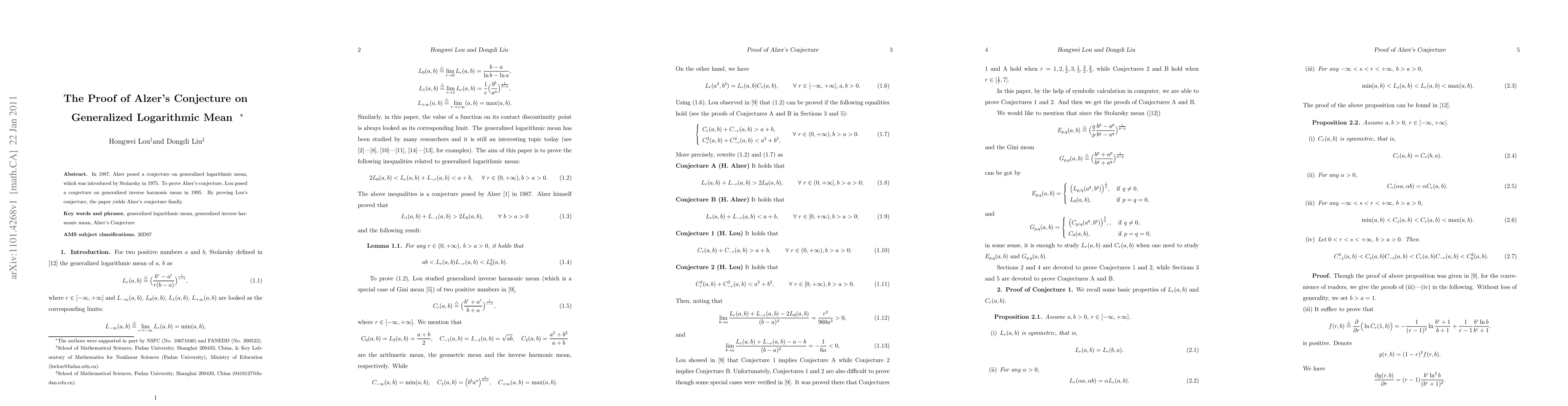 This paper proves Alzer's 1987 conjecture on the generalized logarithmic mean by first establishing Lou's 1995 conjecture on the generalized inverse harmonic mean, thereby validating the original conjecture.